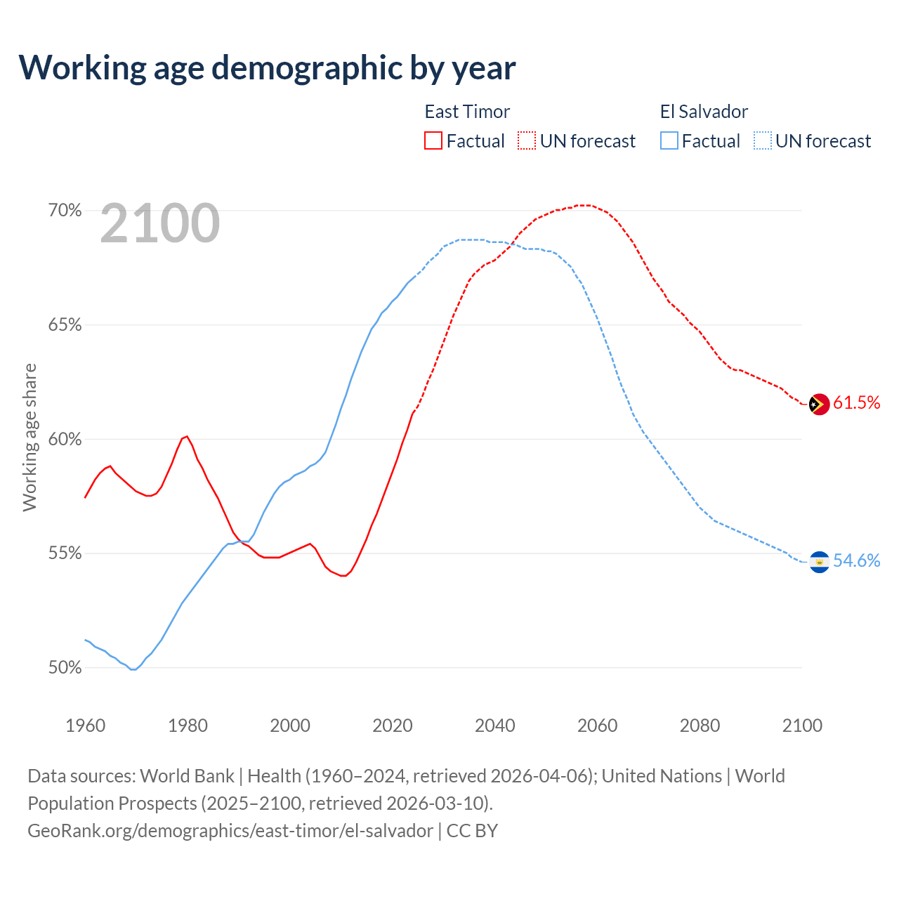 - East Timor has 880K working age adults (aged 15-64) vs 4.29M in El Salvador.