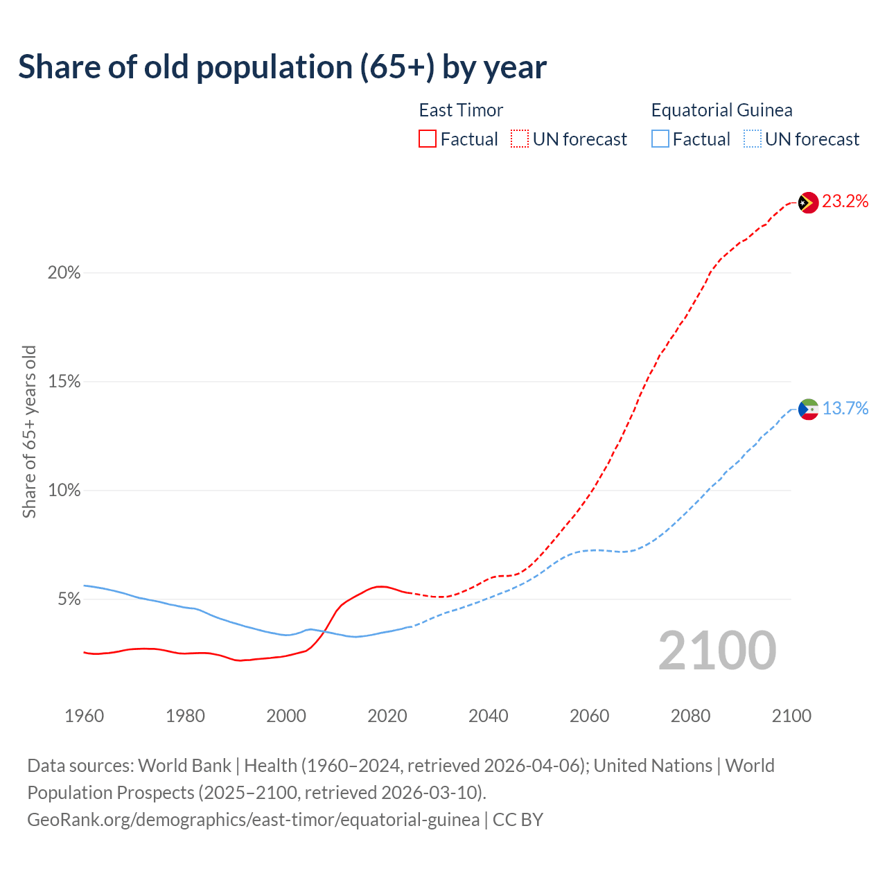- The share of old-age demographic (65+) in East Timor is 5.28% vs 3.69% in Equatorial Guinea.