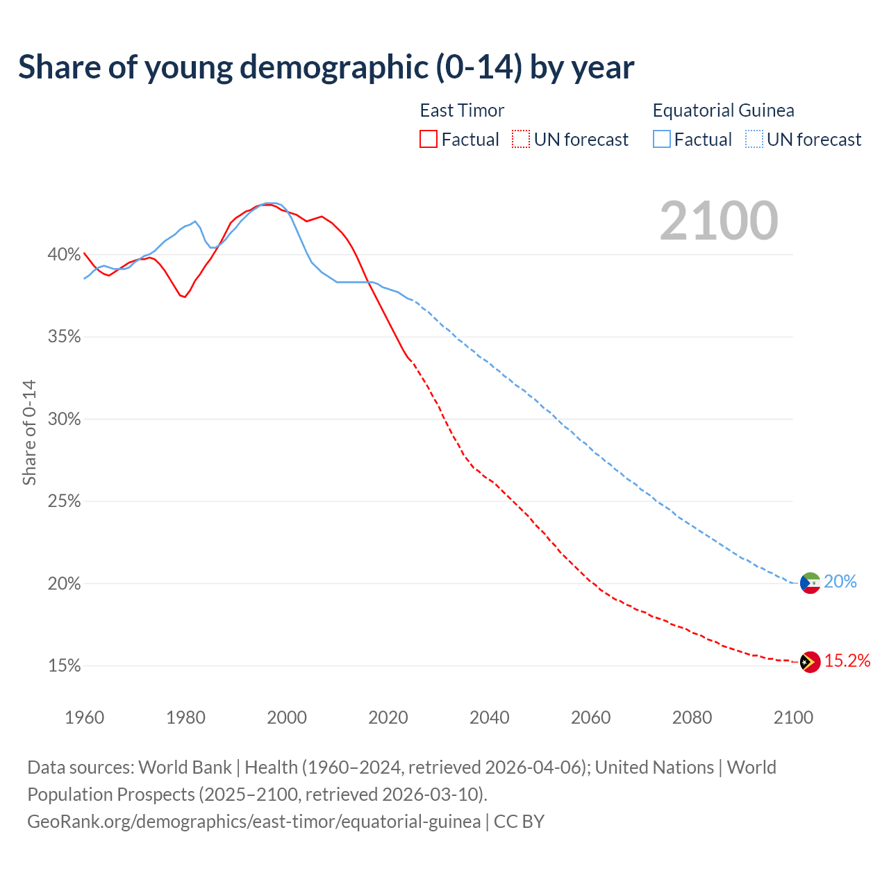 - The share of young demographic (0-15 years old) in East Timor is 33.7% vs 37.3% in Equatorial Guinea.