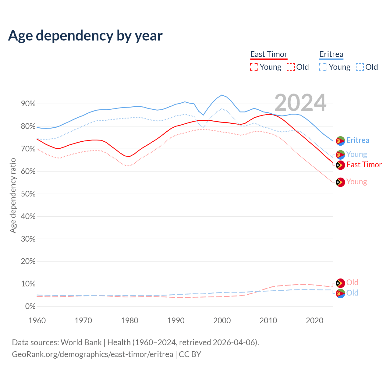 - The share of old-age demographic (65+) in East Timor is 5.28% vs 4.2% in Eritrea.