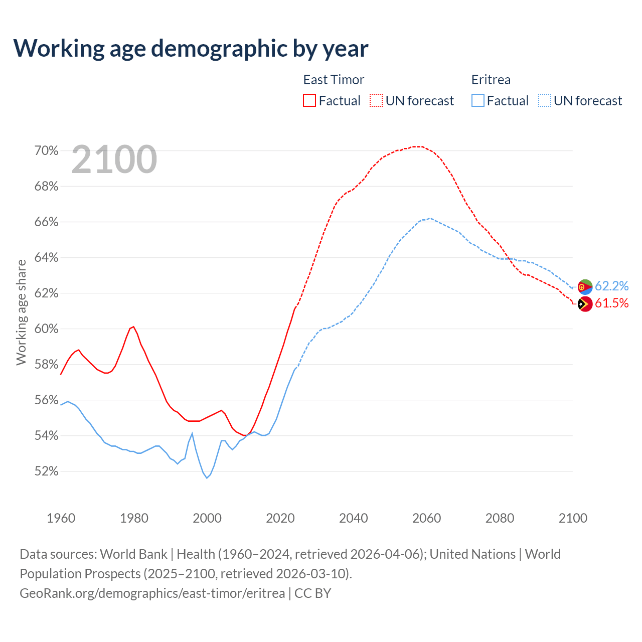 - East Timor has 880K working age adults (aged 15-64) vs 2.13M in Eritrea.