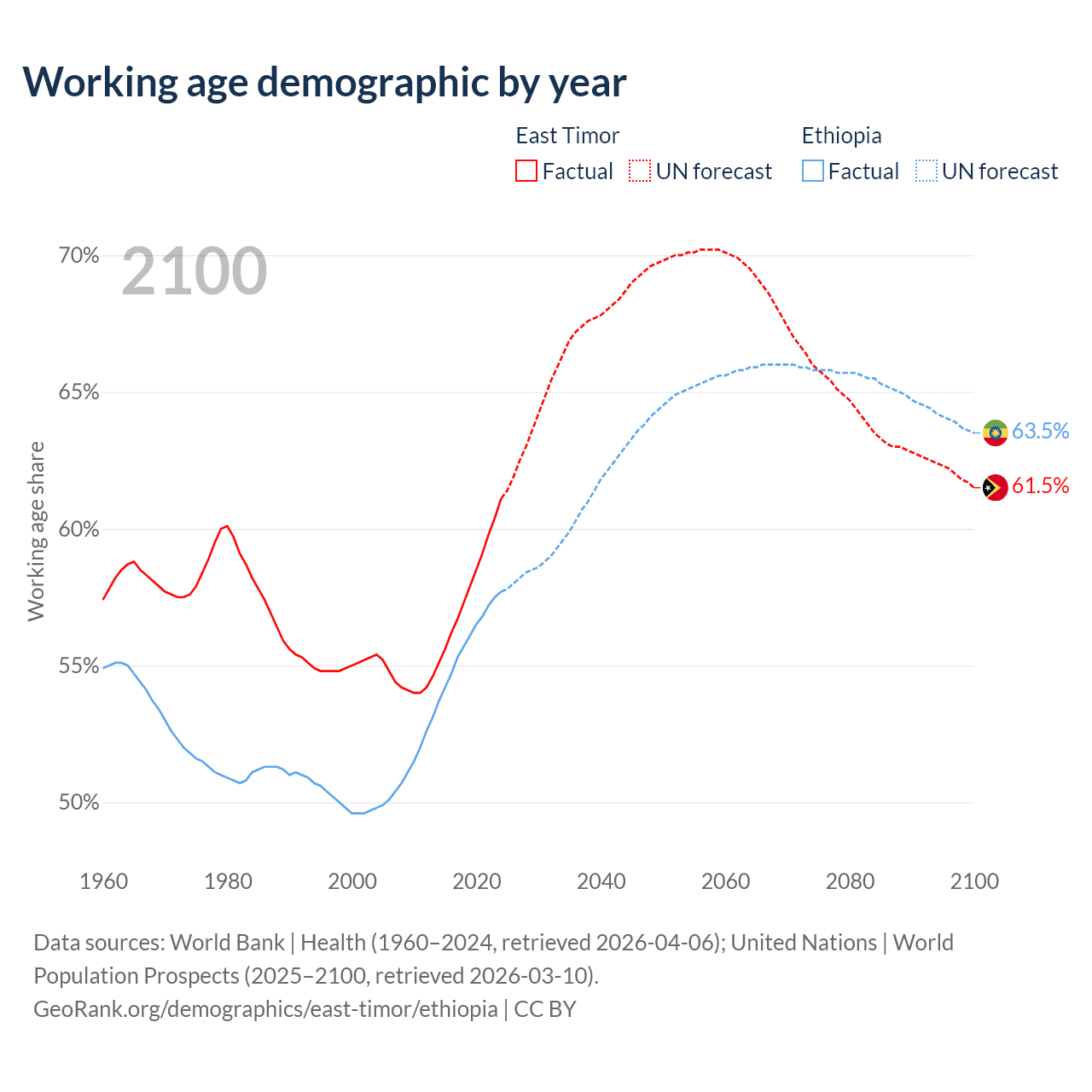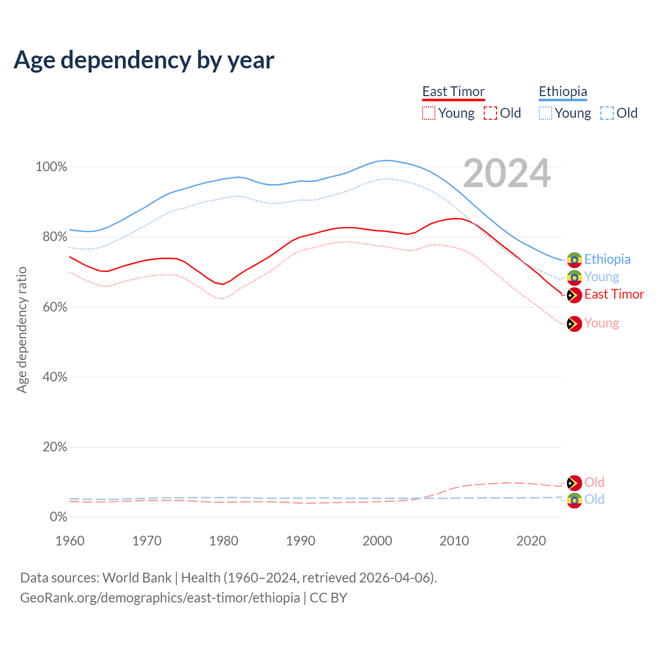 - The share of old-age demographic (65+) in East Timor is 5.28% vs 3.23% in Ethiopia.