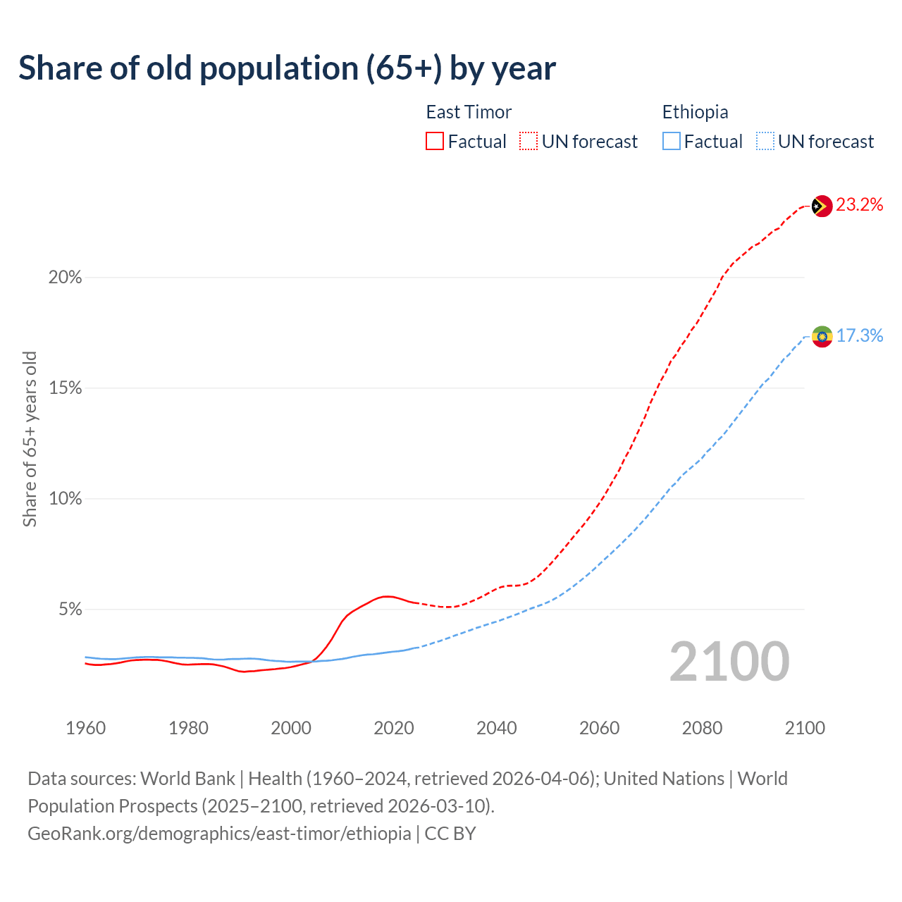 The share of older people aged 65 and over is 5.28% in East Timor and 3.23% in Ethiopia. Life expectancy in East Timor compared to Ethiopia .