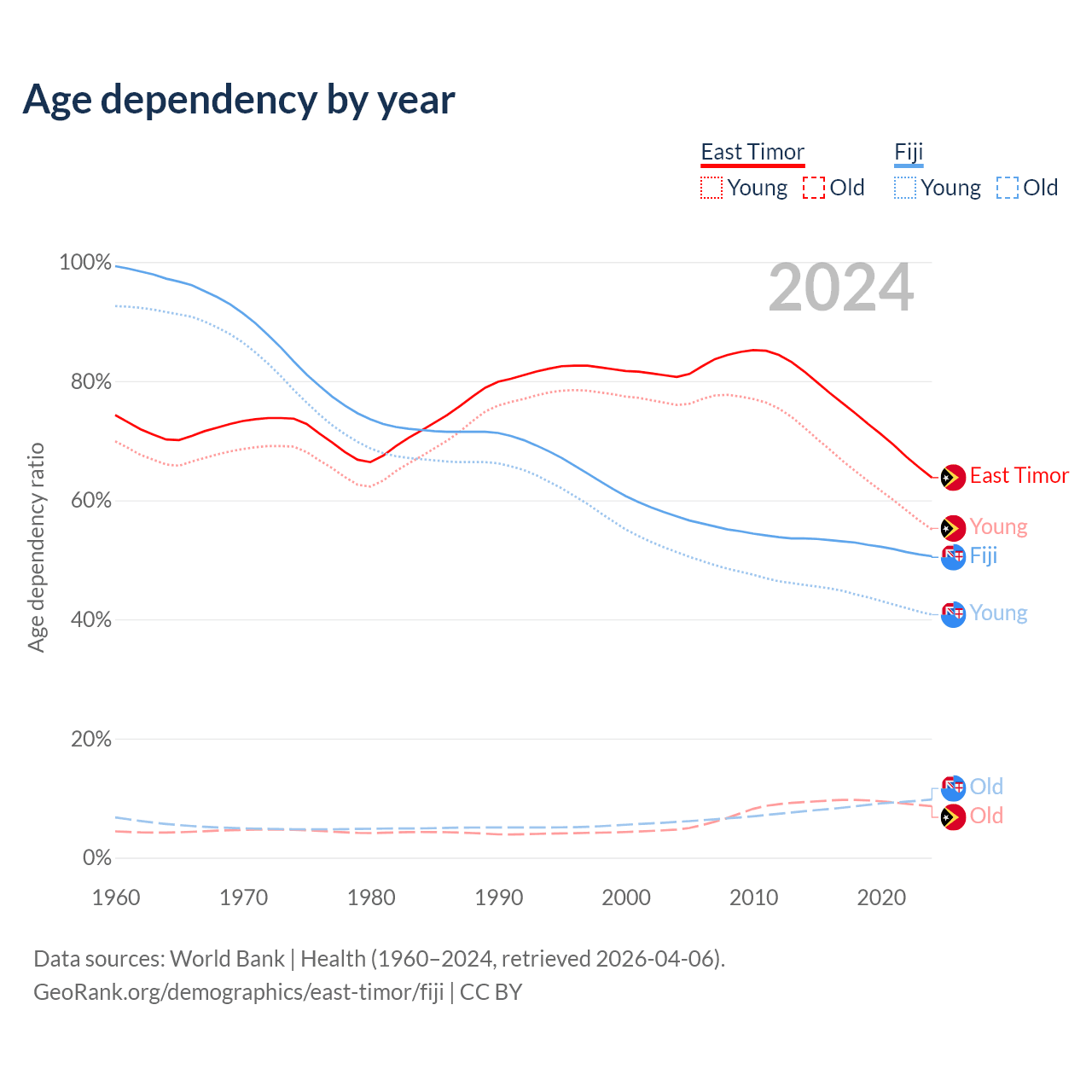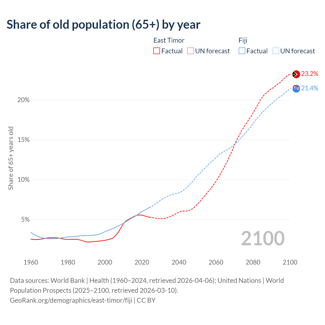 - The share of old-age demographic (65+) in East Timor is 5.28% vs 6.49% in Fiji.