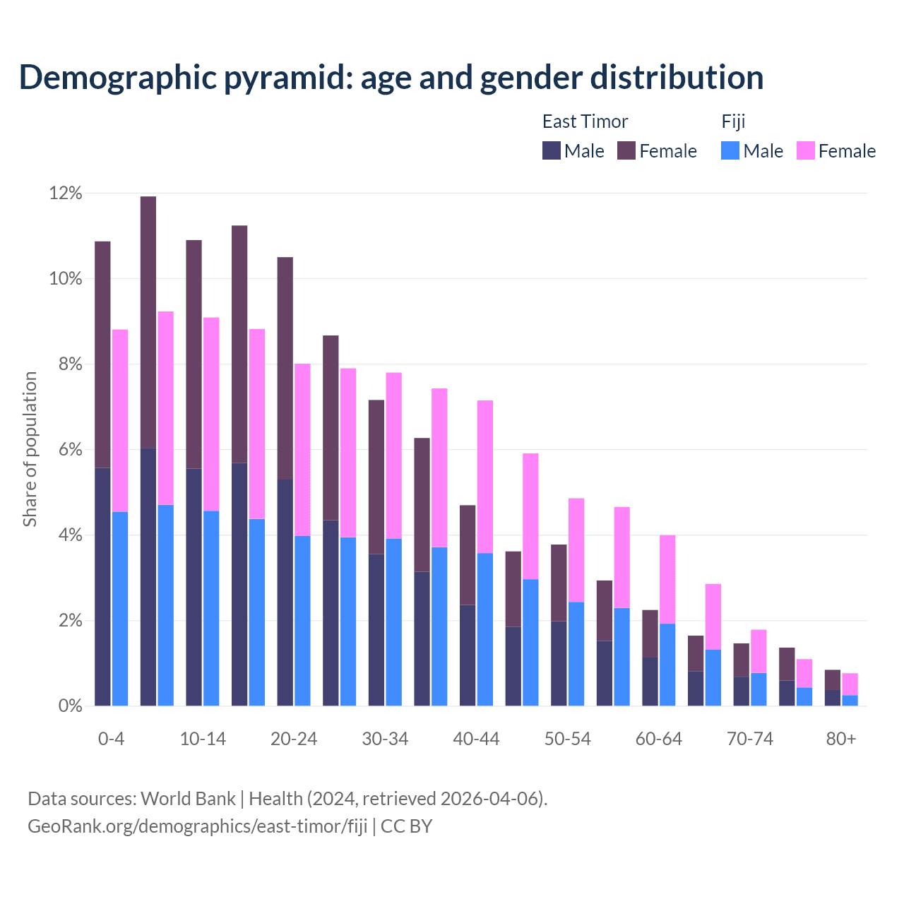 - East Timor is ranked 145/196 by median age (oldest to youngest) vs 113/196 for Fiji.
