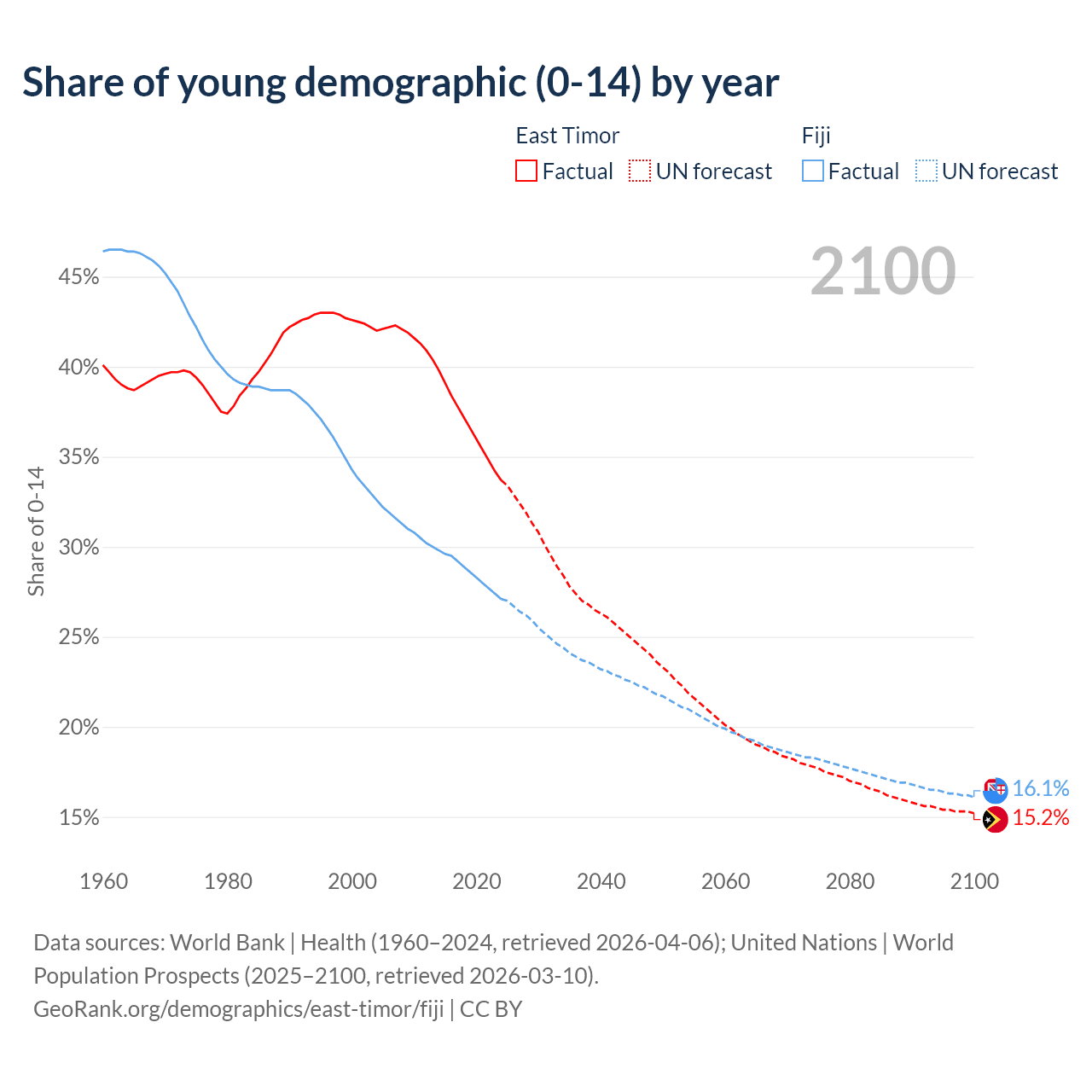 - The share of young demographic (0-15 years old) in East Timor is 33.7% vs 27.1% in Fiji.