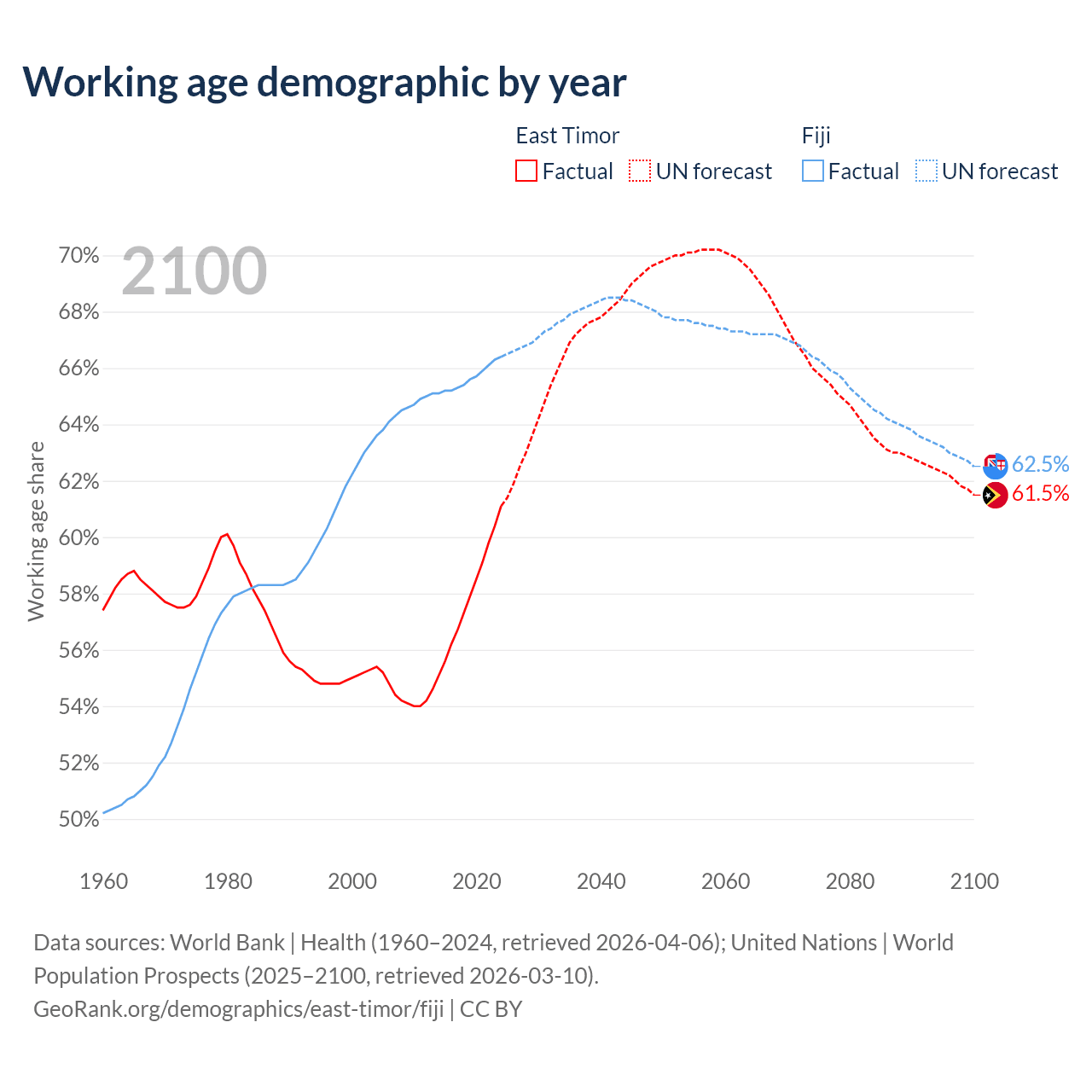 - East Timor has 880K working age adults (aged 15-64) vs 623K in Fiji.