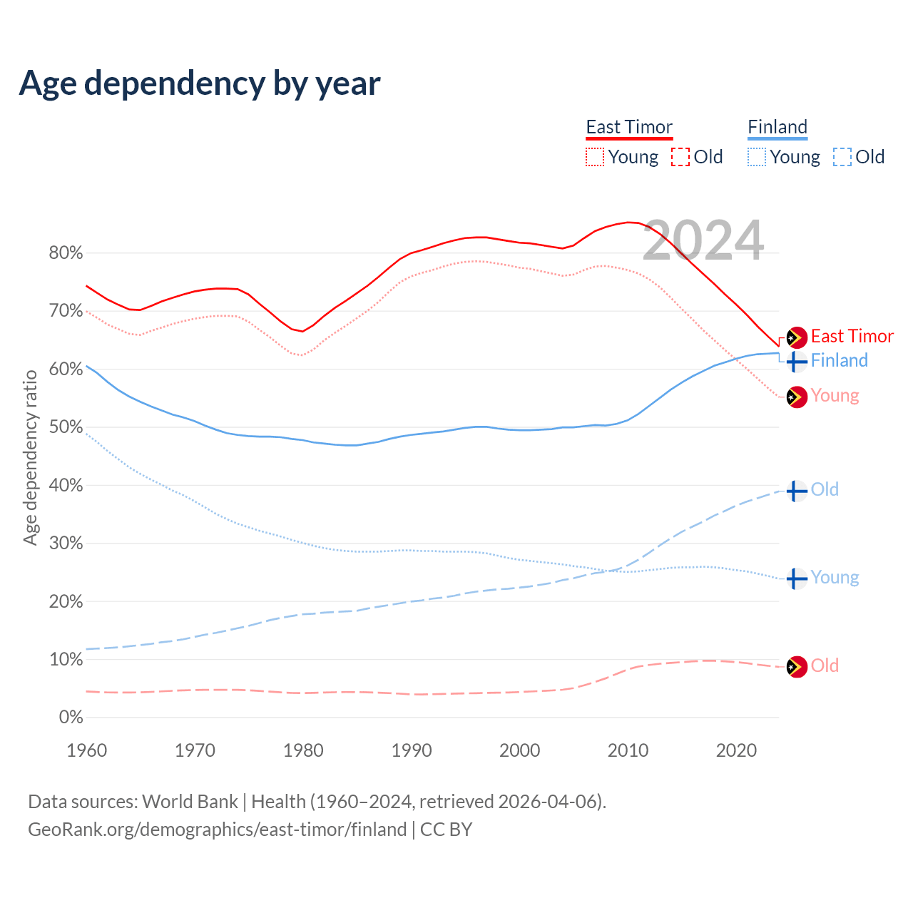 - The share of old-age demographic (65+) in East Timor is 5.28% vs 23.9% in Finland.