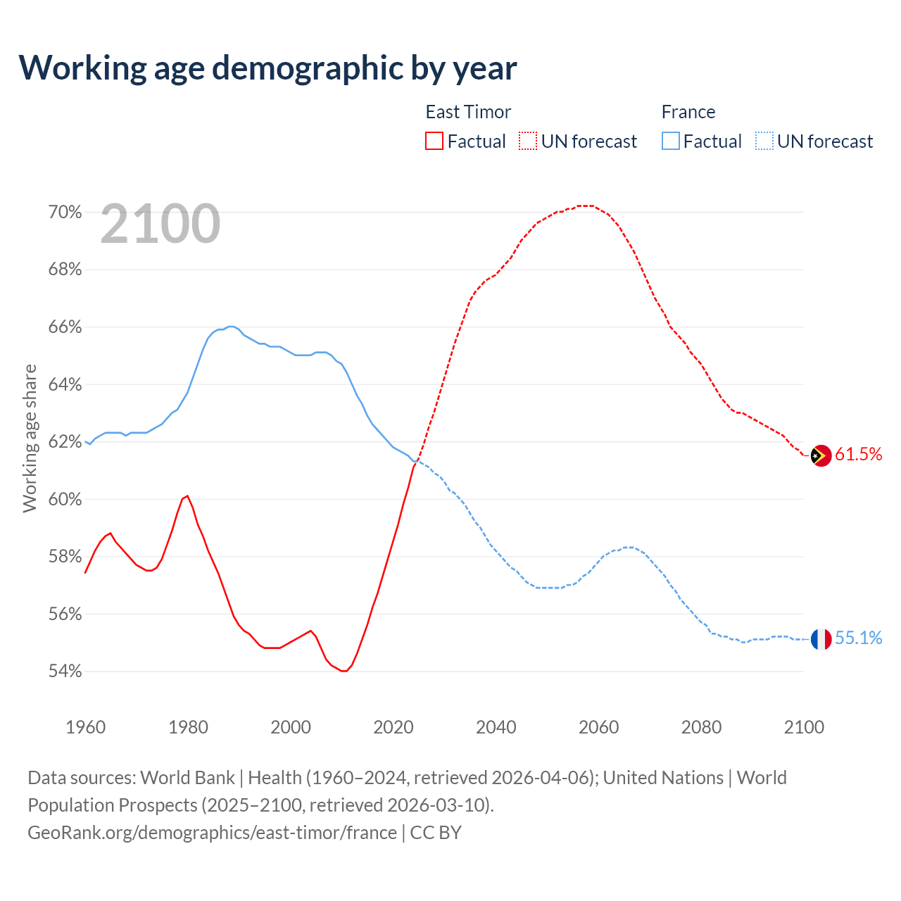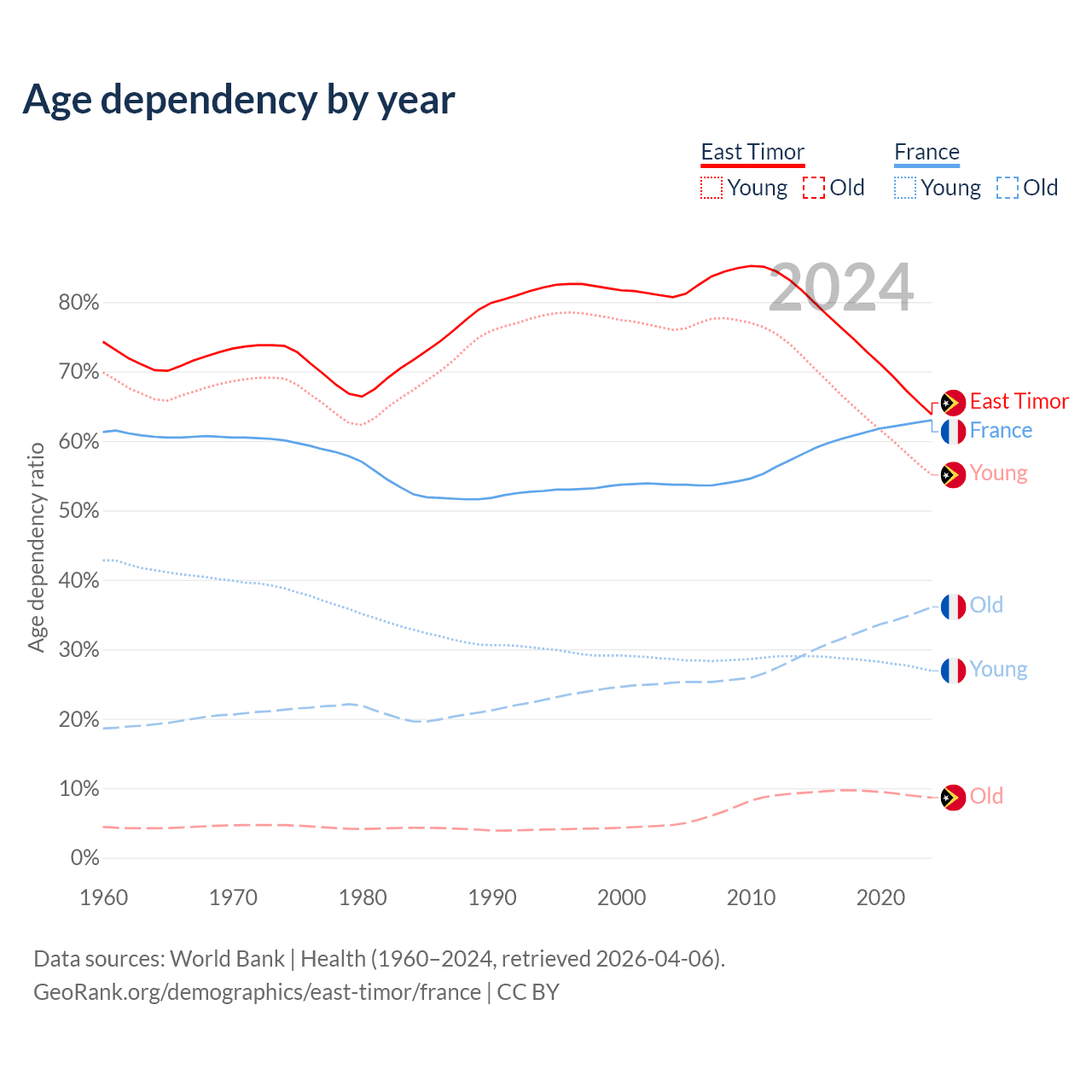 - The share of old-age demographic (65+) in East Timor is 5.28% vs 22.1% in France.