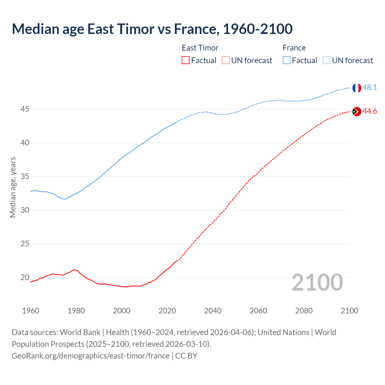 Median age East Timor vs France, 1960-2100