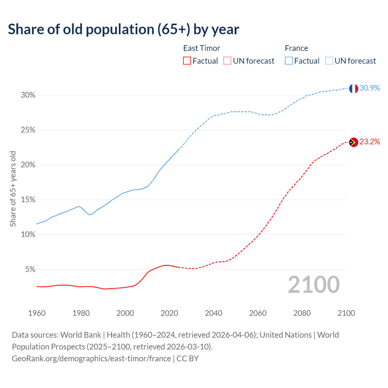 The share of older people aged 65 and over is 5.28% in East Timor and 22.1% in France. Life expectancy in East Timor compared to France .