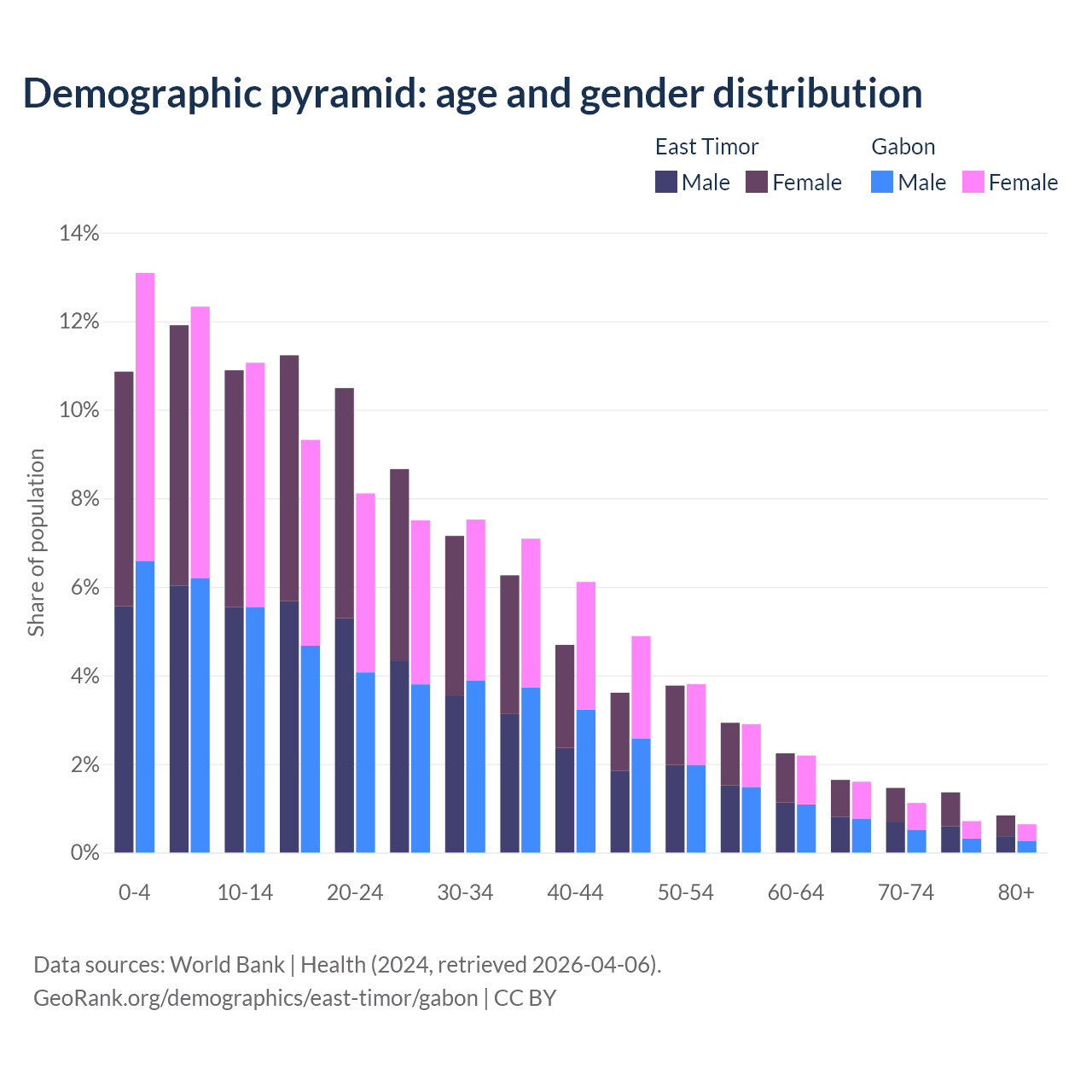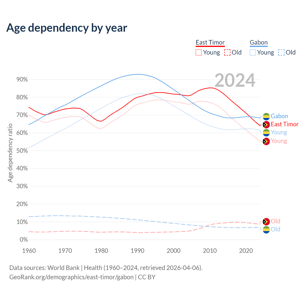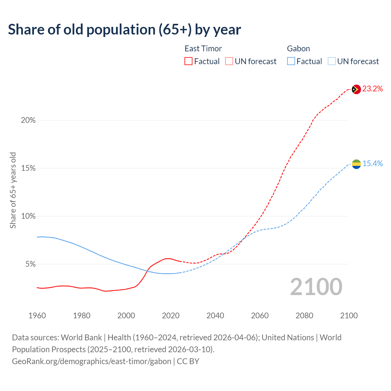 - The share of old-age demographic (65+) in East Timor is 5.28% vs 4.08% in Gabon.