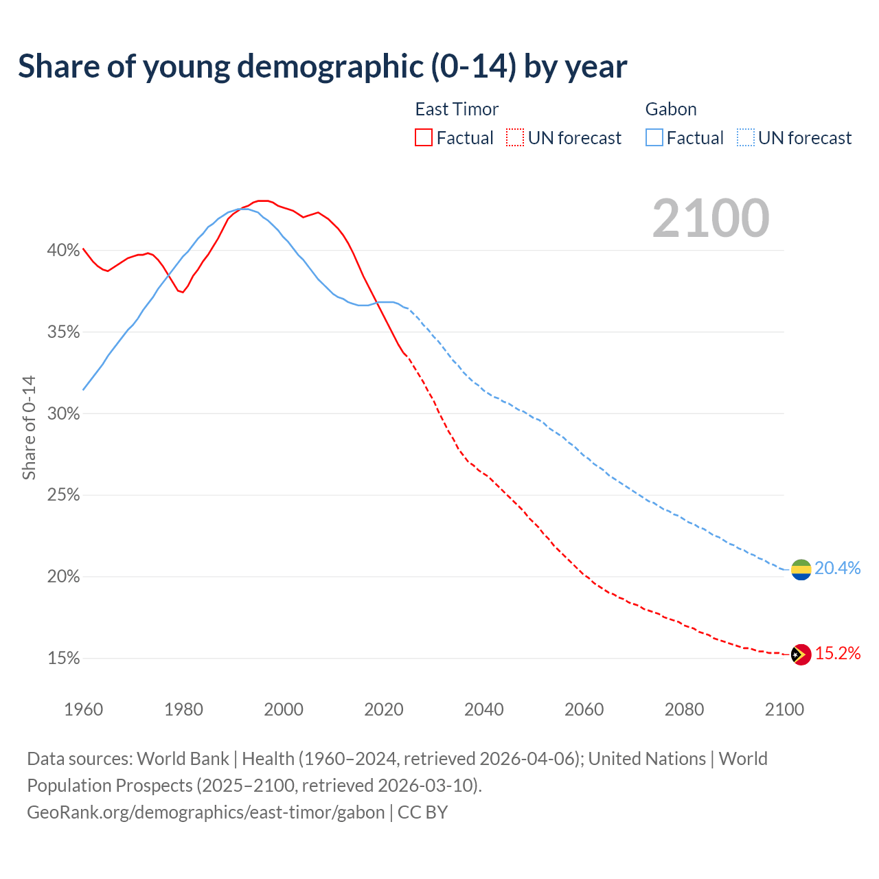 - The share of young demographic (0-15 years old) in East Timor is 33.7% vs 36.5% in Gabon.