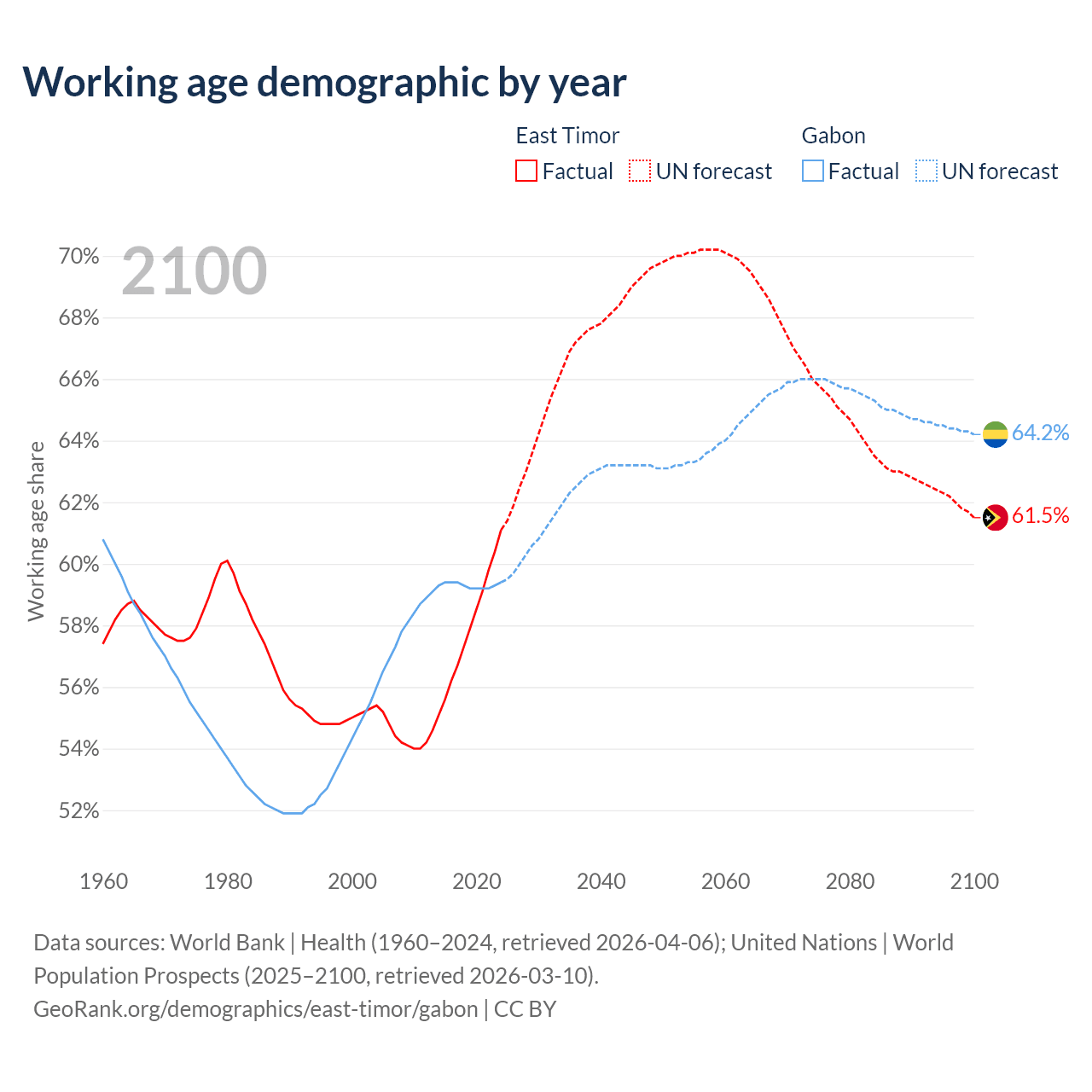 - East Timor has 880K working age adults (aged 15-64) vs 1.58M in Gabon.