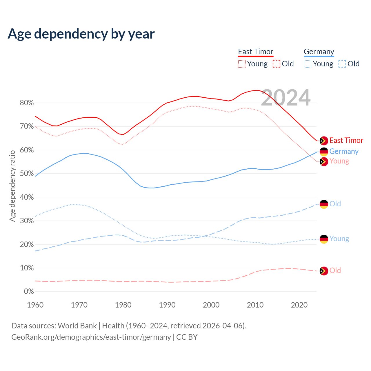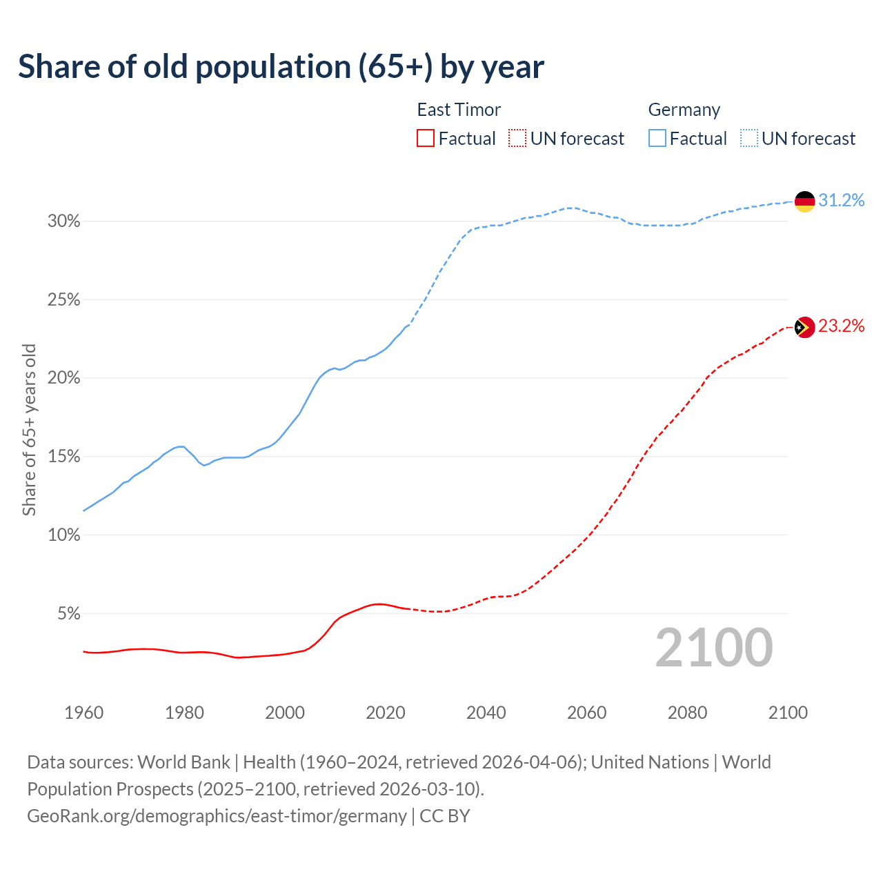 - The share of old-age demographic (65+) in East Timor is 5.28% vs 23.2% in Germany.