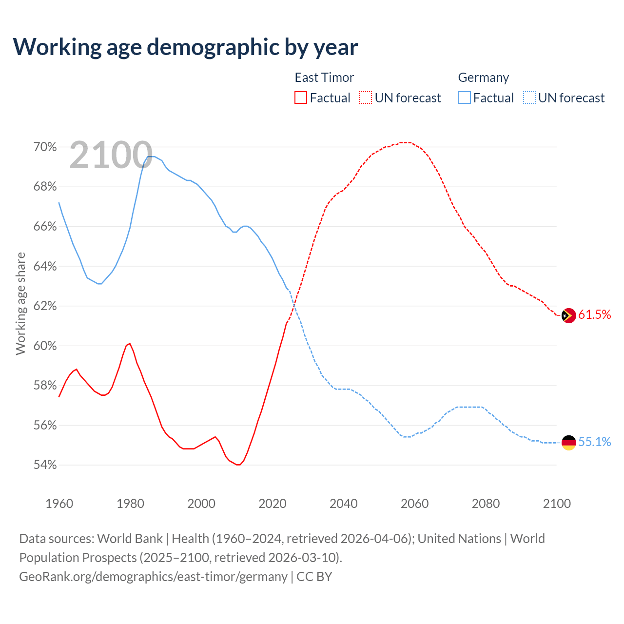 - East Timor has 880K working age adults (aged 15-64) vs 51.9M in Germany.