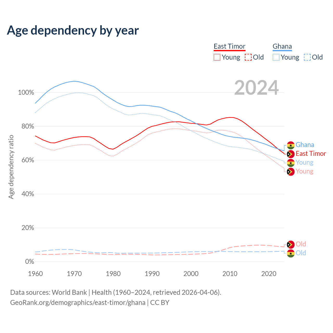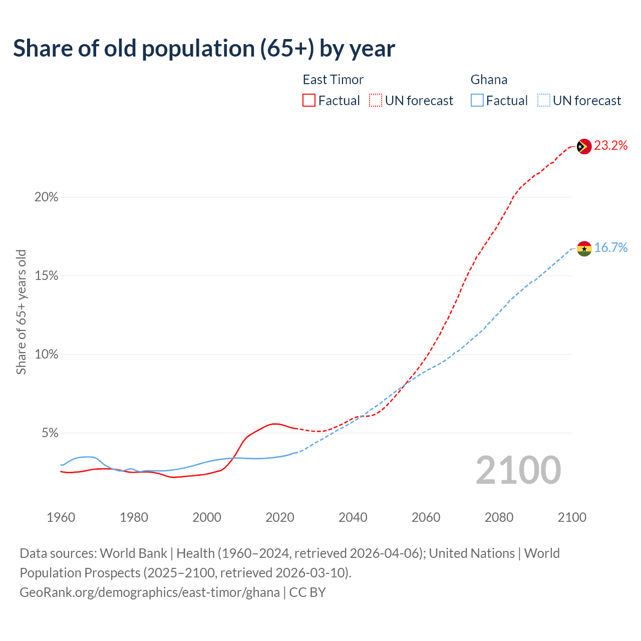 - The share of old-age demographic (65+) in East Timor is 5.28% vs 3.71% in Ghana.