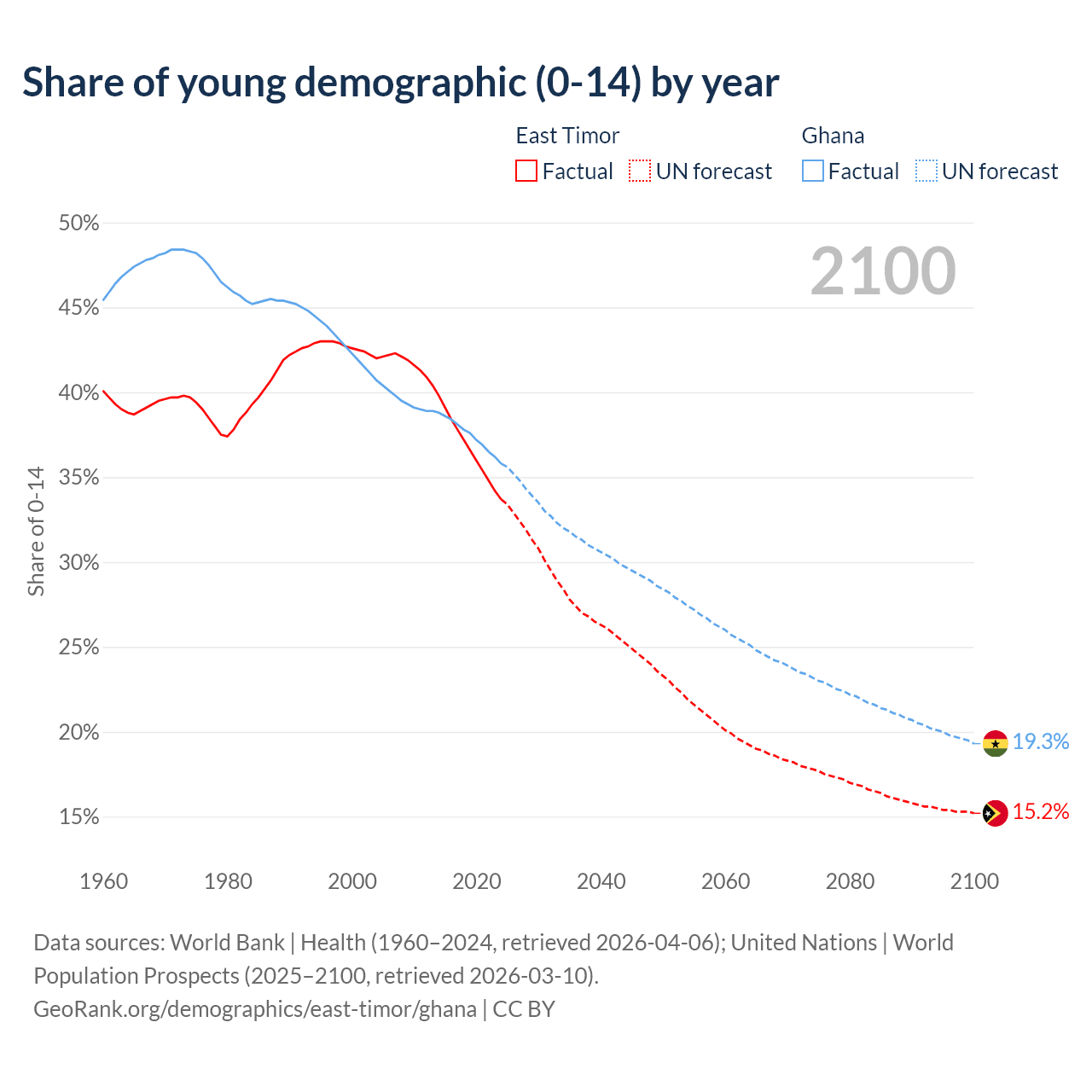 - The share of young demographic (0-15 years old) in East Timor is 33.7% vs 35.8% in Ghana.