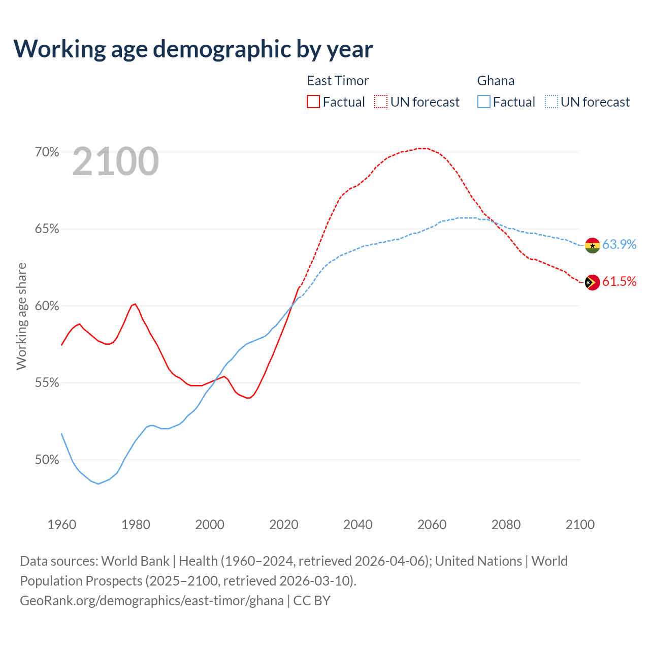 Median age East Timor vs Ghana, 1960-2100
