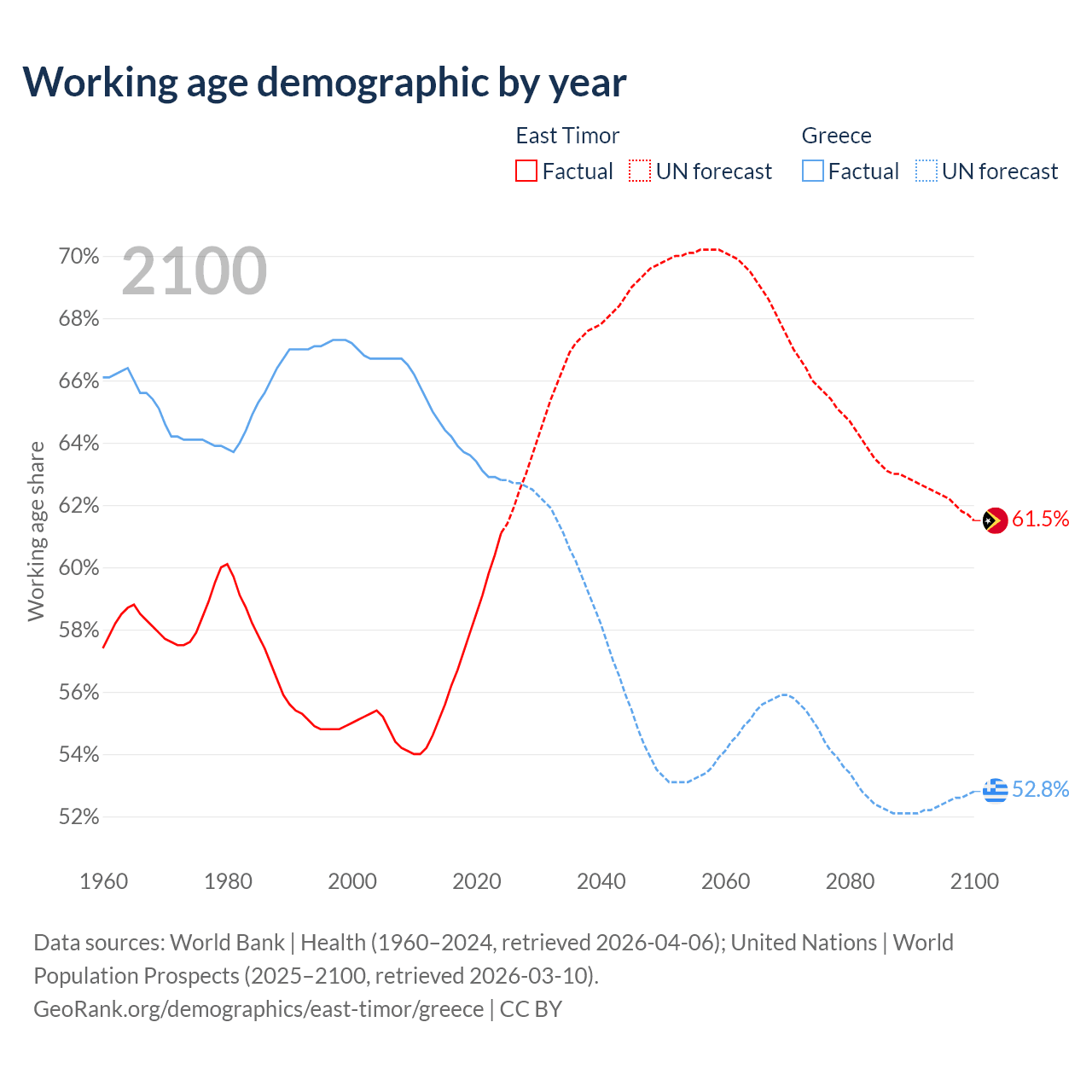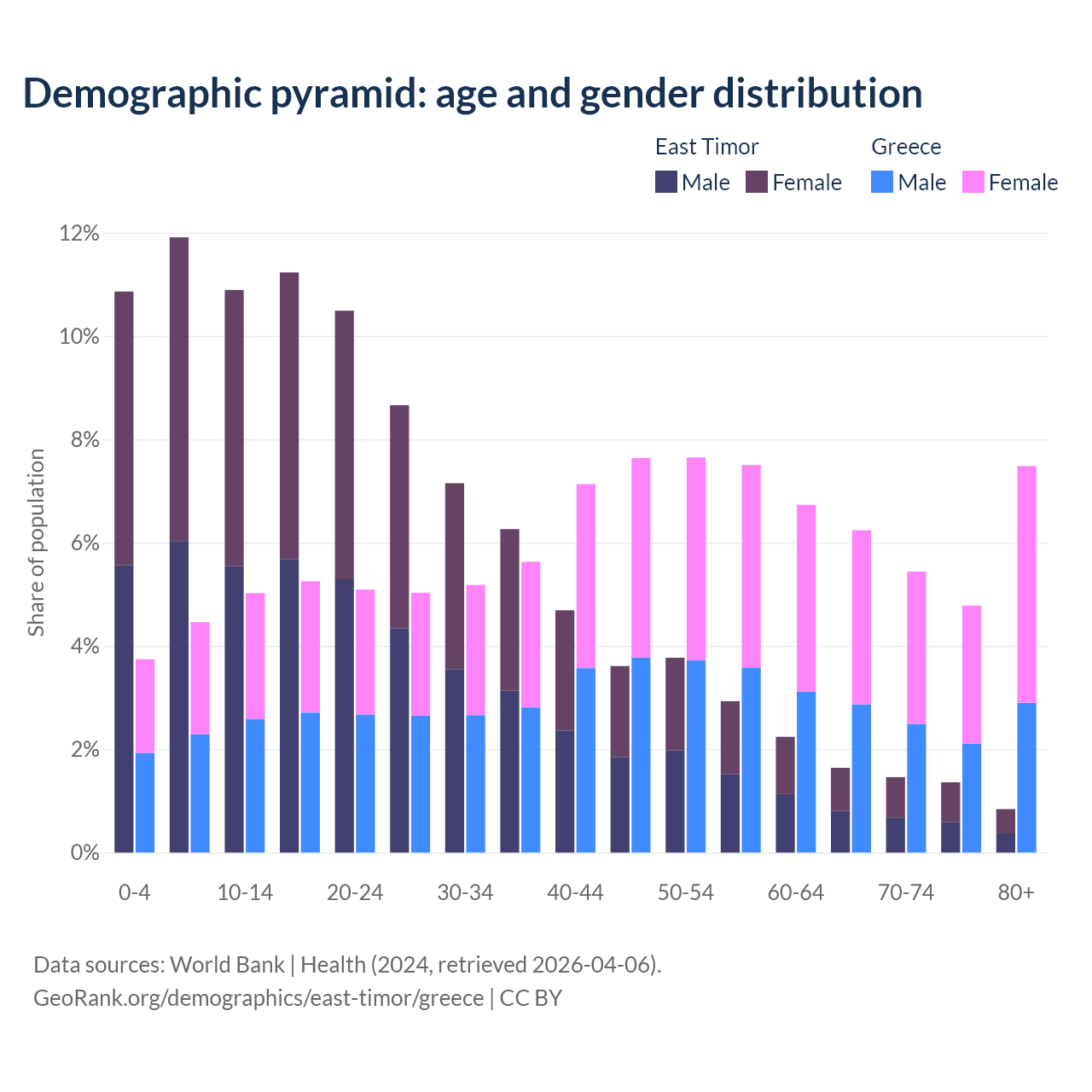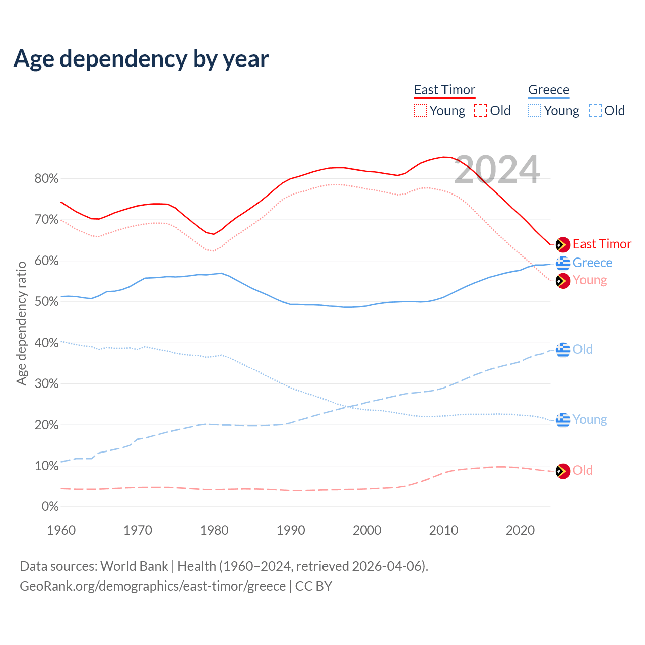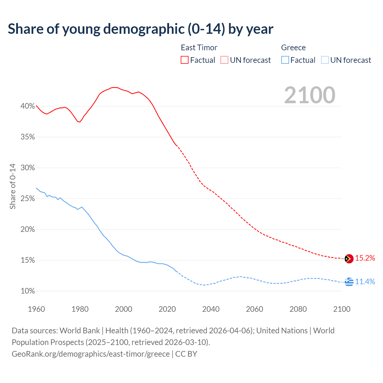 - The share of young demographic (0-15 years old) in East Timor is 33.7% vs 13.2% in Greece.