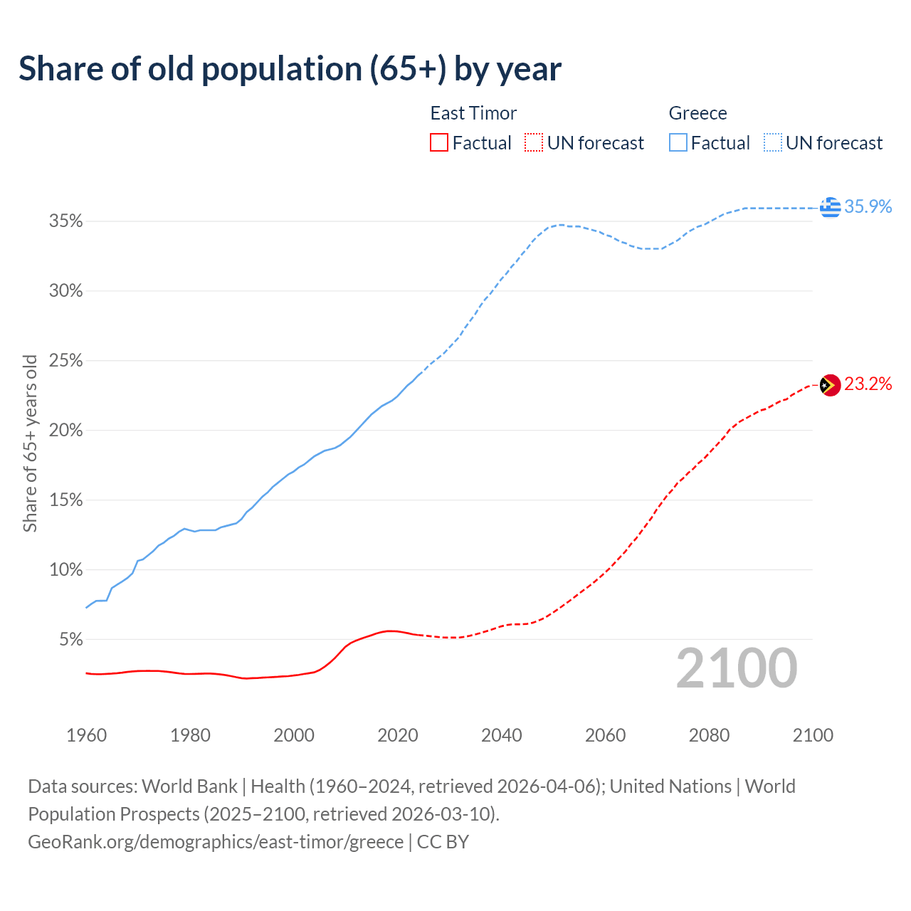 - The share of old-age demographic (65+) in East Timor is 5.28% vs 23.9% in Greece.