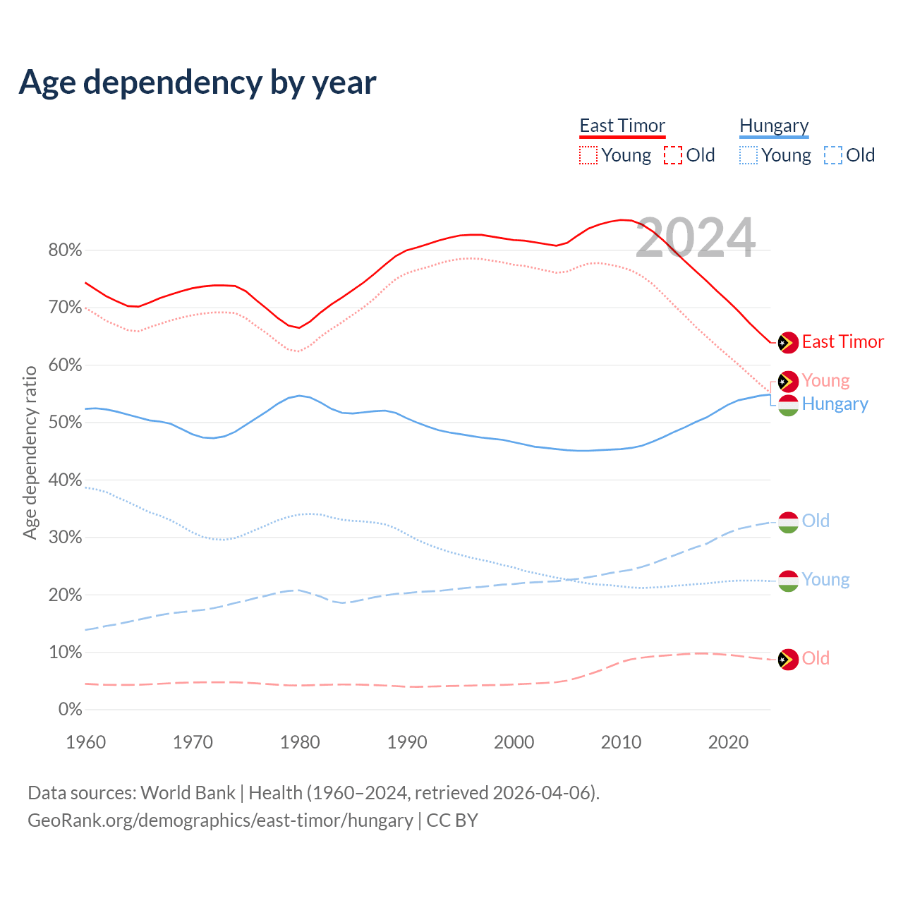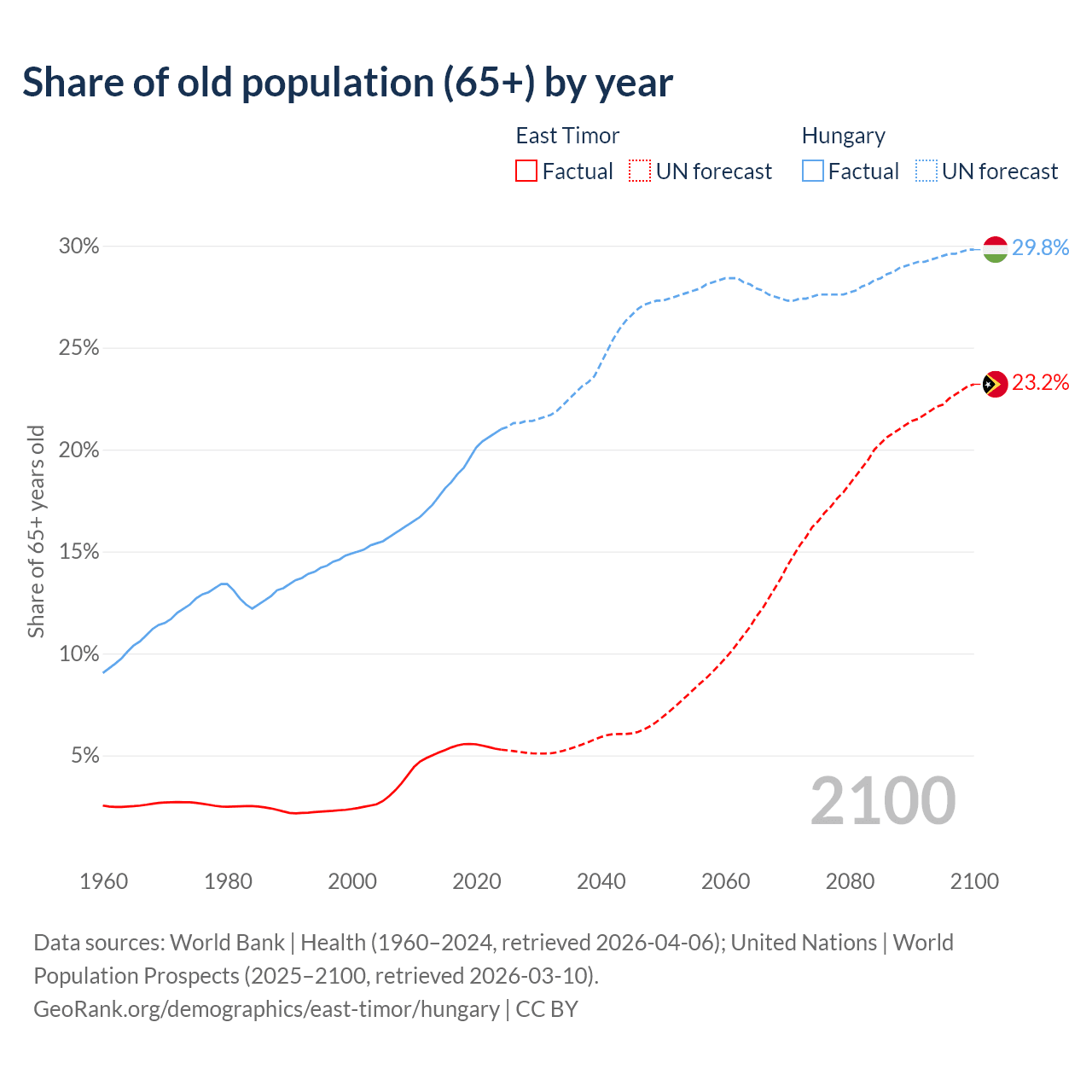 - The share of old-age demographic (65+) in East Timor is 5.28% vs 21% in Hungary.