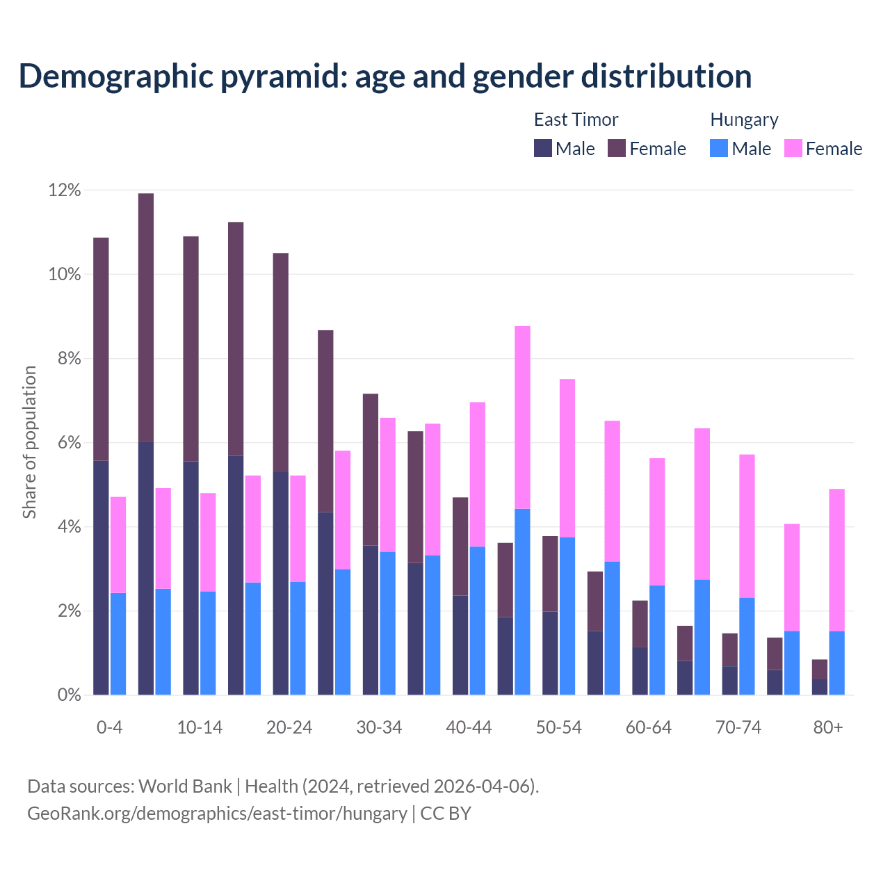 - As of 2026, the population of East Timor is 1.44M vs 9.48M in Hungary - 6.57 times difference.