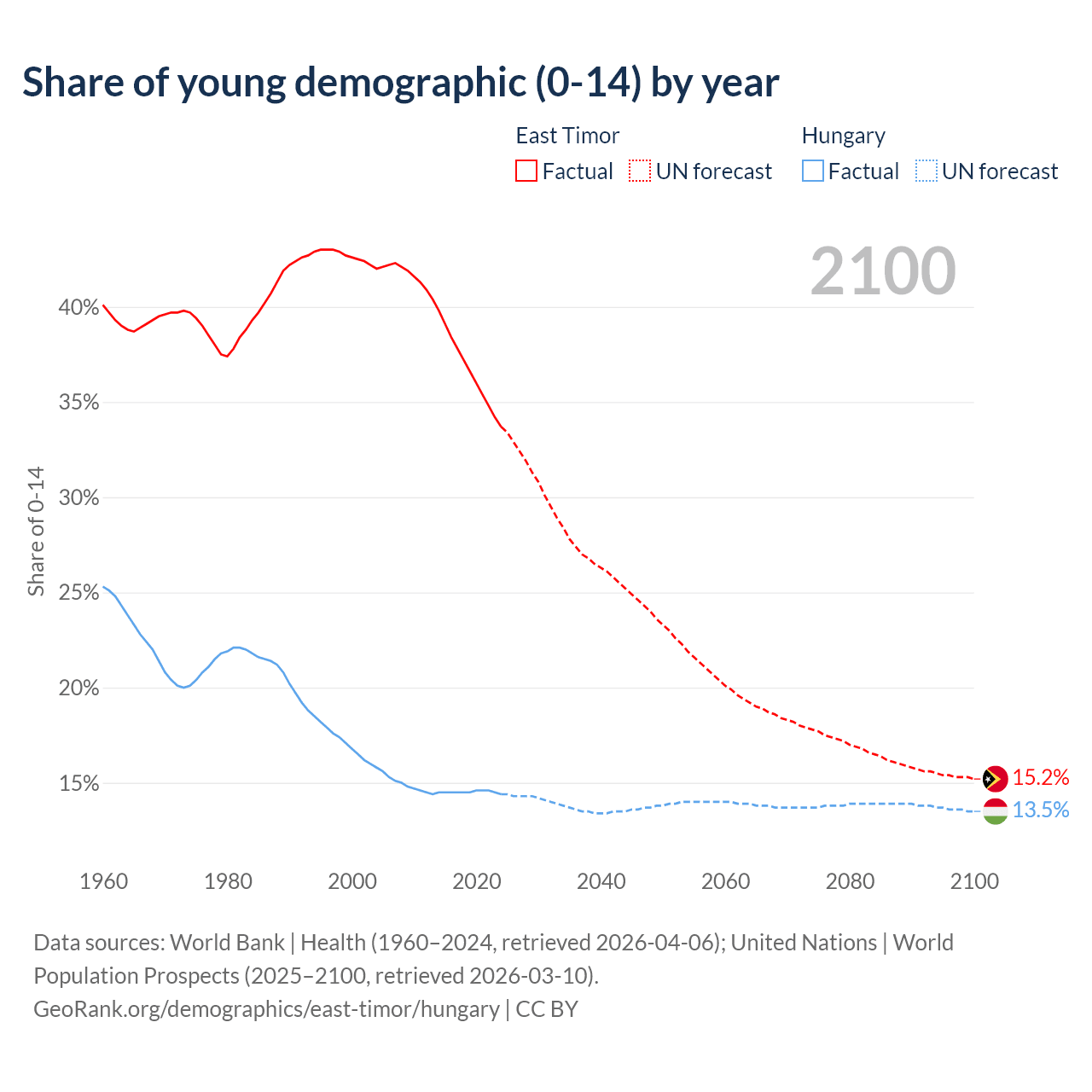 - The share of young demographic (0-15 years old) in East Timor is 33.7% vs 14.4% in Hungary.