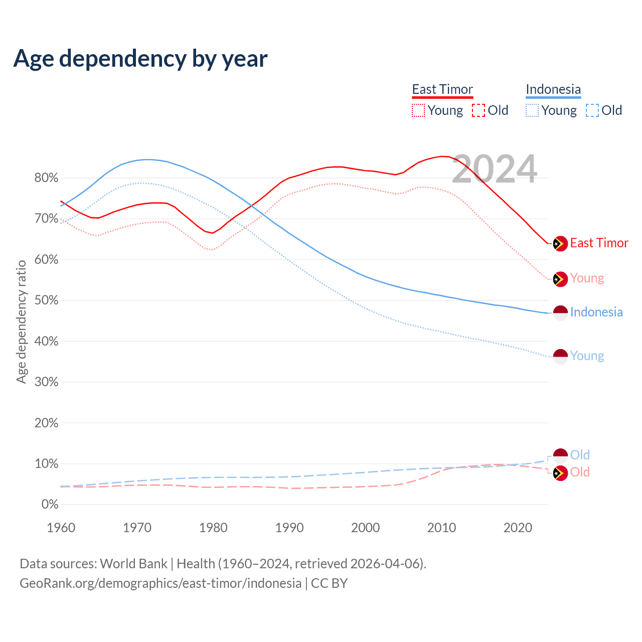 - East Timor is ranked 145/196 by median age (oldest to youngest) vs 93/196 for Indonesia.