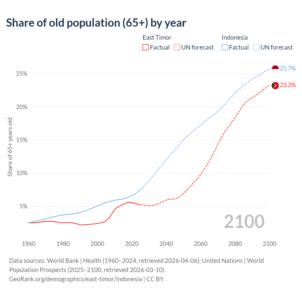 The share of older people aged 65 and over is 5.28% in East Timor and 7.29% in Indonesia. Life expectancy in East Timor compared to Indonesia .