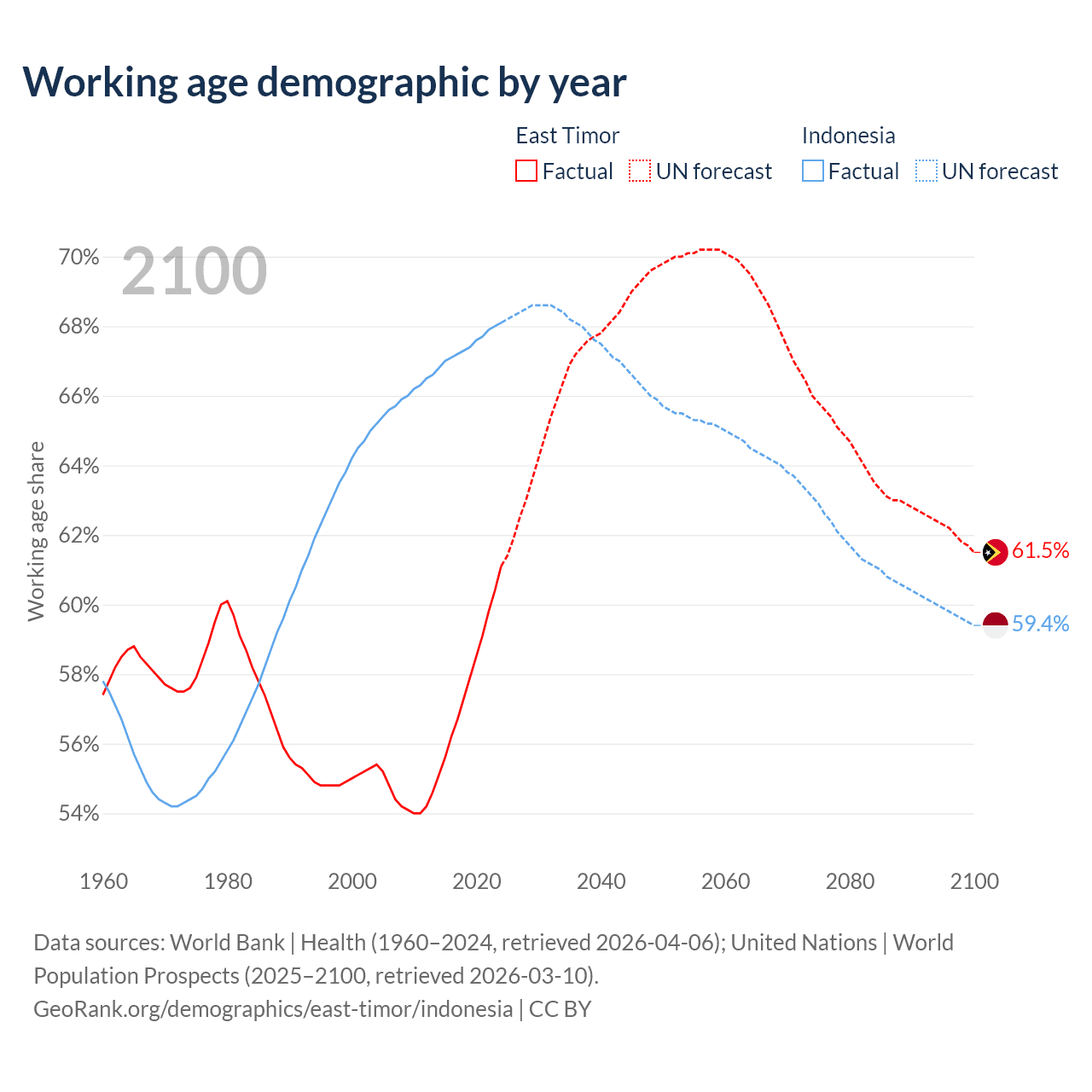 - East Timor has 880K working age adults (aged 15-64) vs 197M in Indonesia.