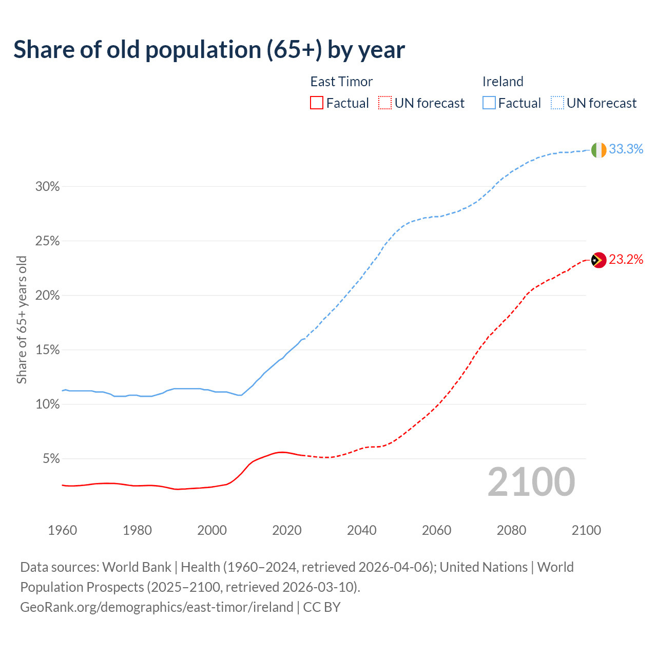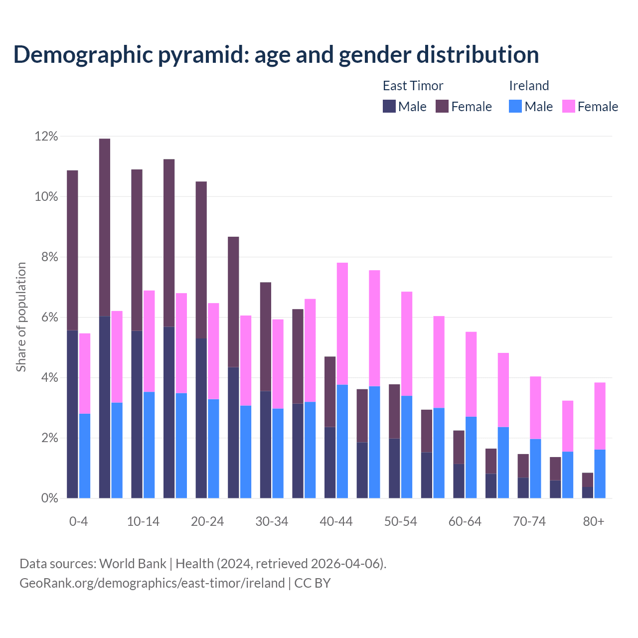 - The share of old-age demographic (65+) in East Timor is 5.28% vs 15.9% in Ireland.