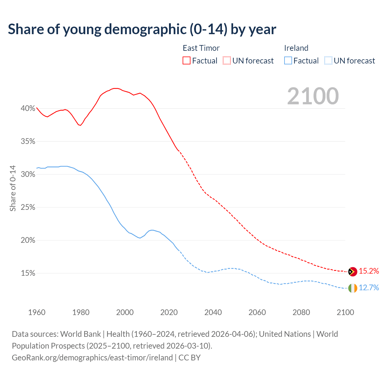 - The share of young demographic (0-15 years old) in East Timor is 33.7% vs 18.6% in Ireland.