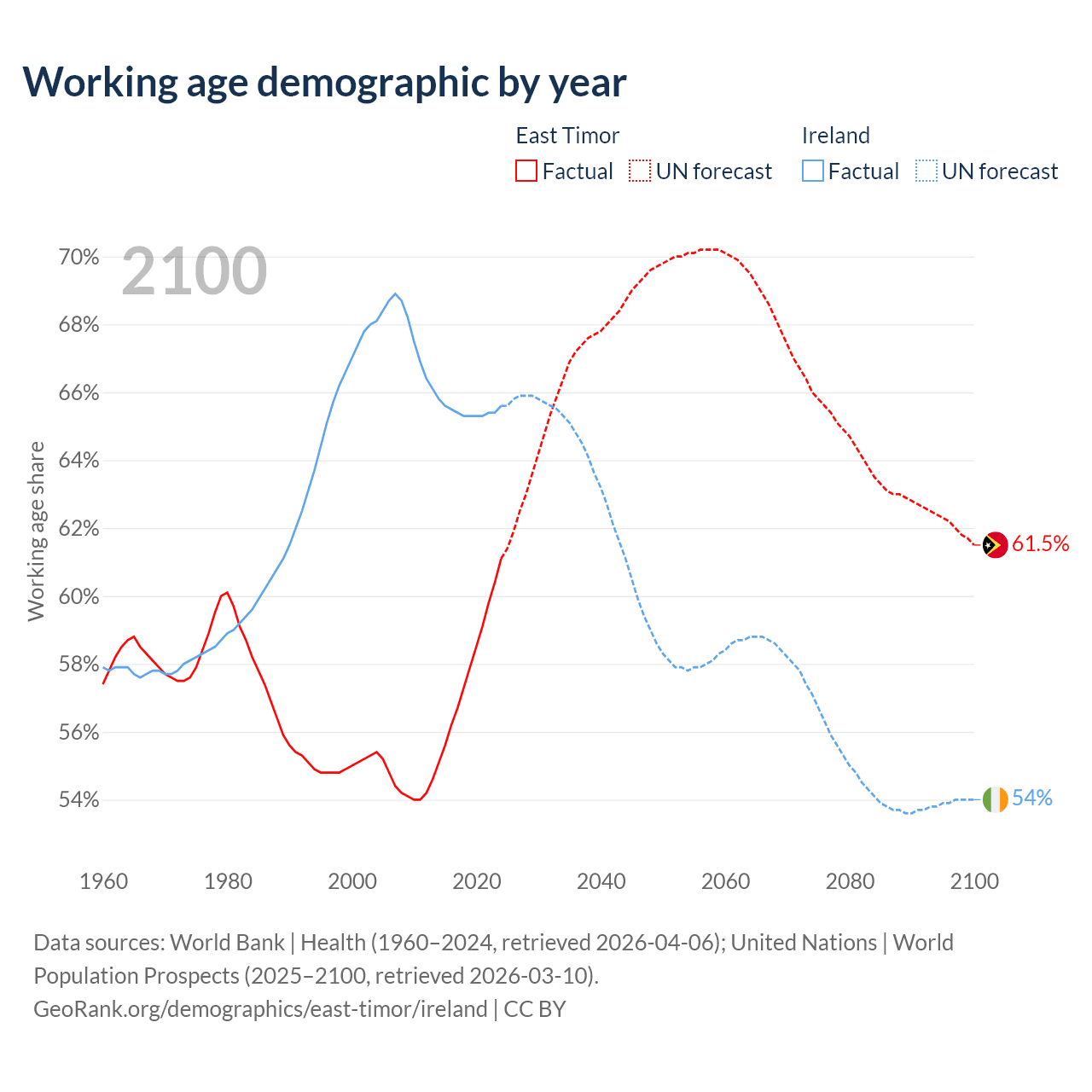 - East Timor has 880K working age adults (aged 15-64) vs 3.62M in Ireland.