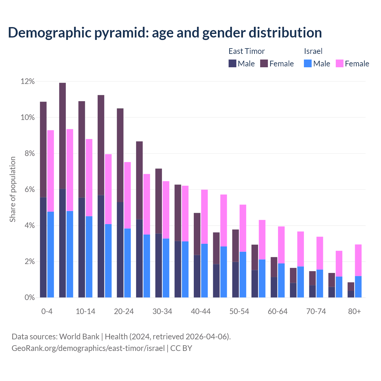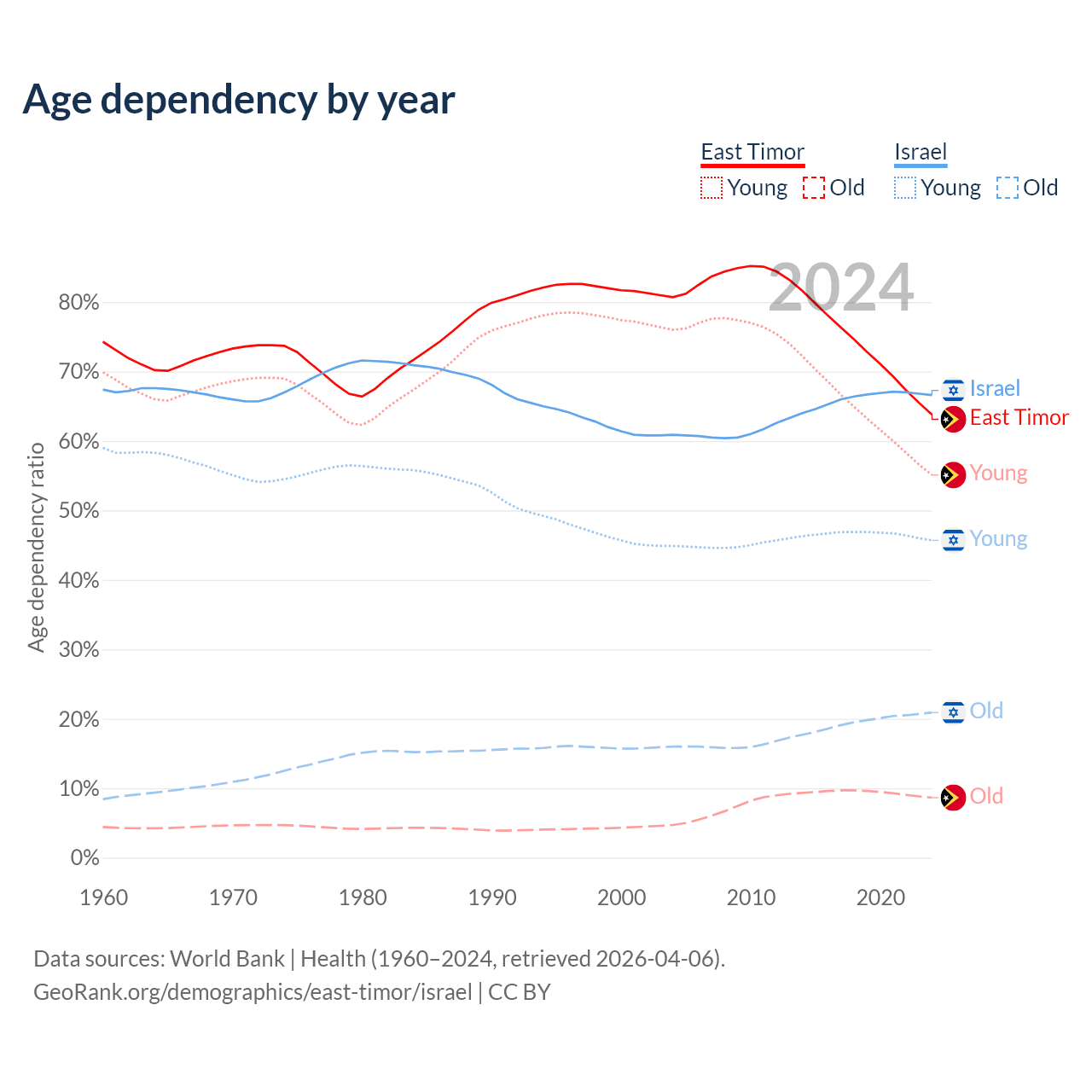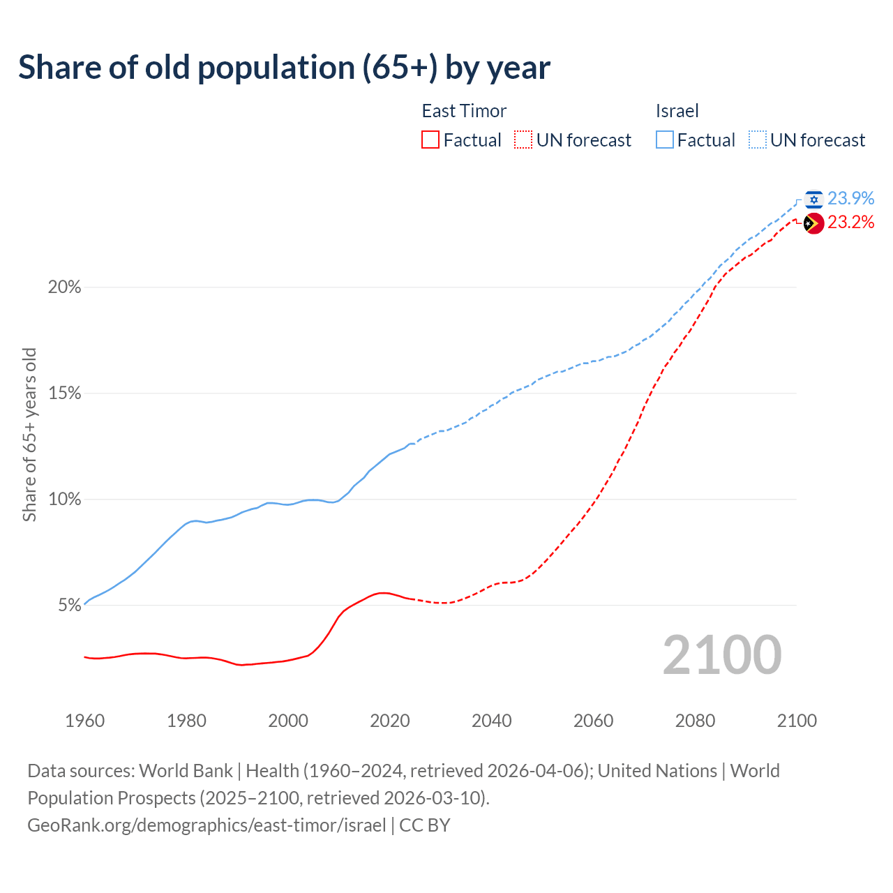 - The share of old-age demographic (65+) in East Timor is 5.28% vs 12.6% in Israel.