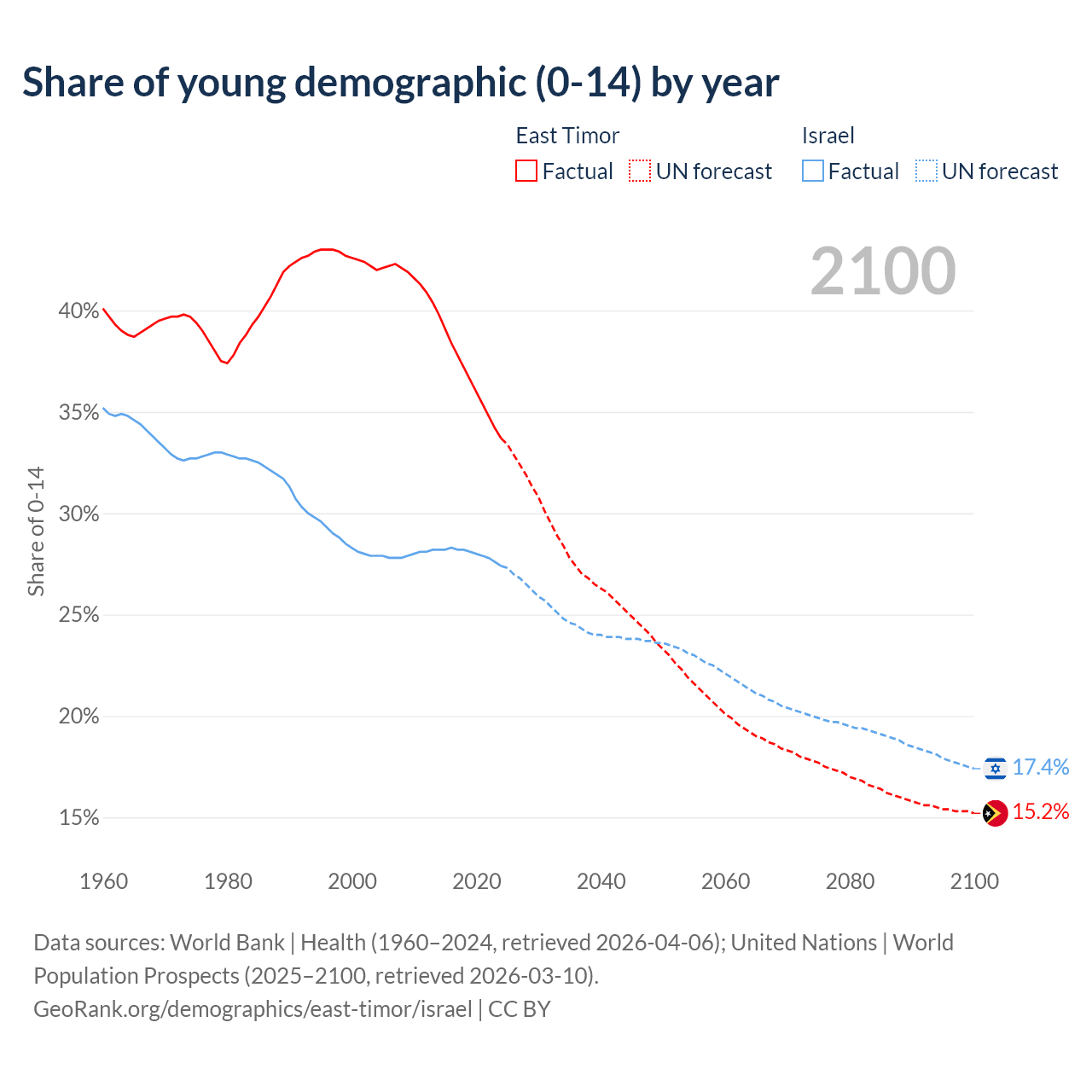 - As of 2026, the population of East Timor is 1.44M vs 10.3M in Israel - 7.14 times difference.