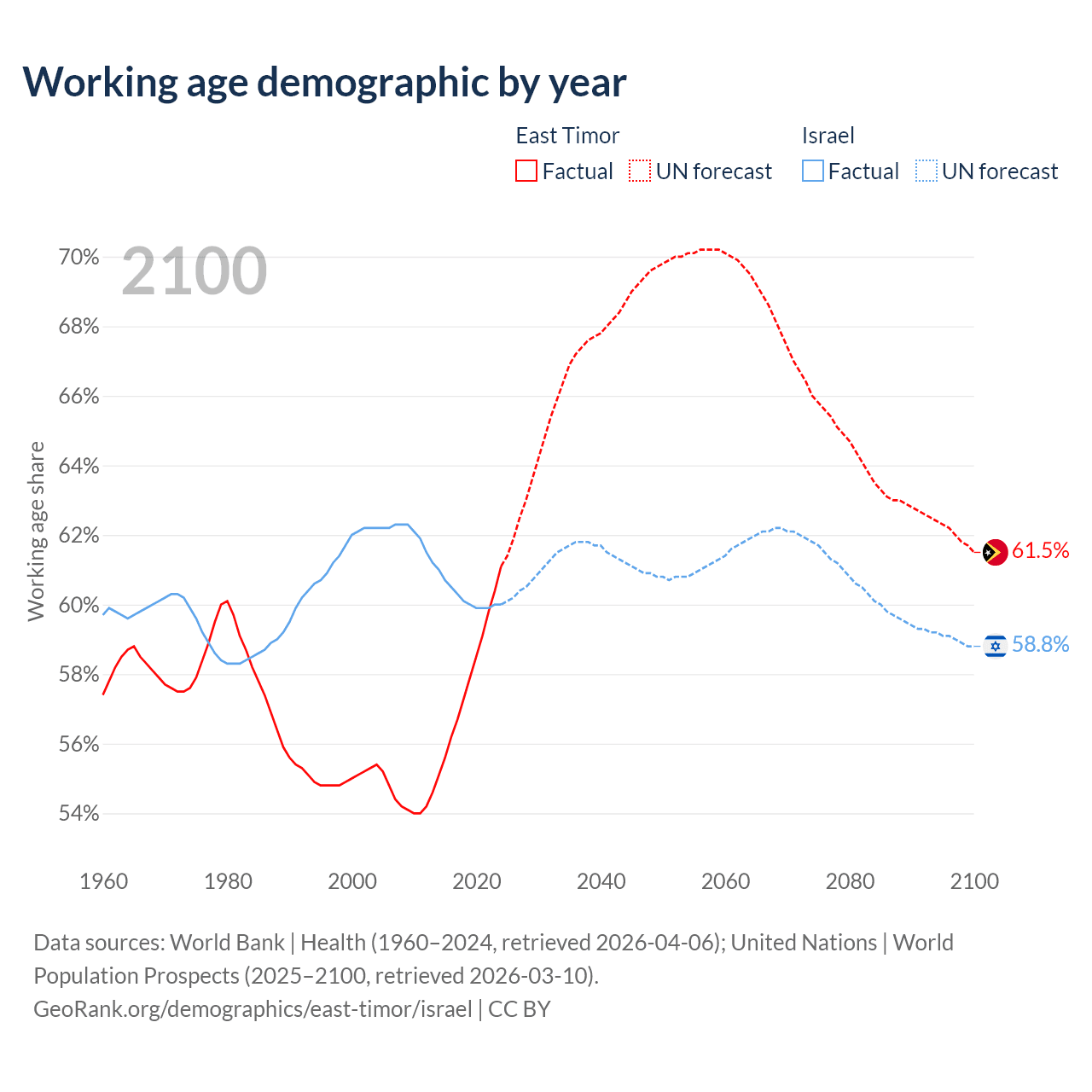 - East Timor has 880K working age adults (aged 15-64) vs 6.18M in Israel.
