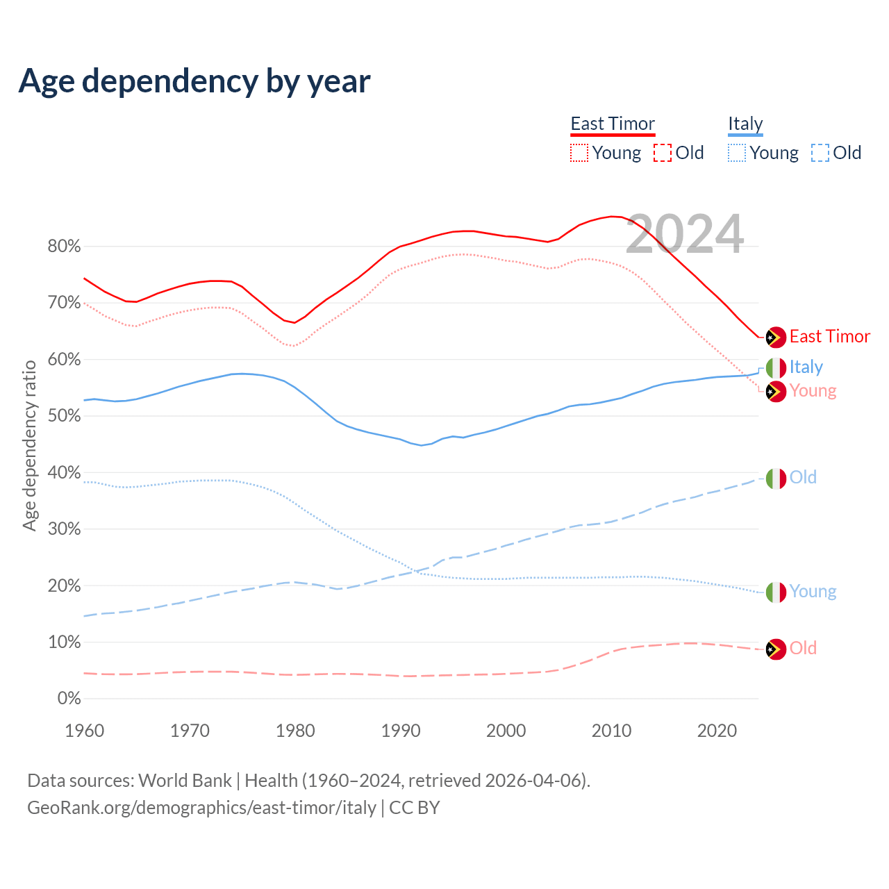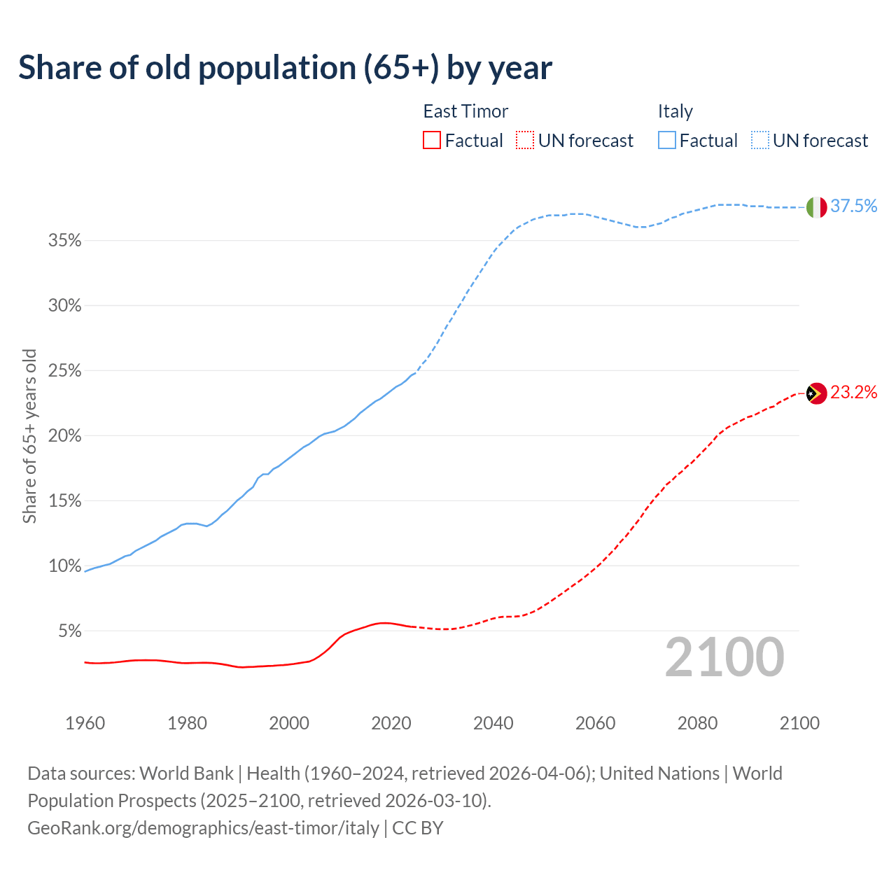 The share of older people aged 65 and over is 5.28% in East Timor and 24.6% in Italy. Life expectancy in East Timor compared to Italy .