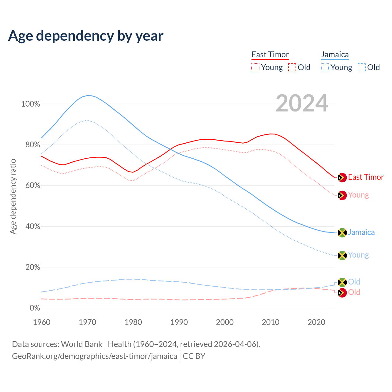 - The share of old-age demographic (65+) in East Timor is 5.28% vs 8.21% in Jamaica.