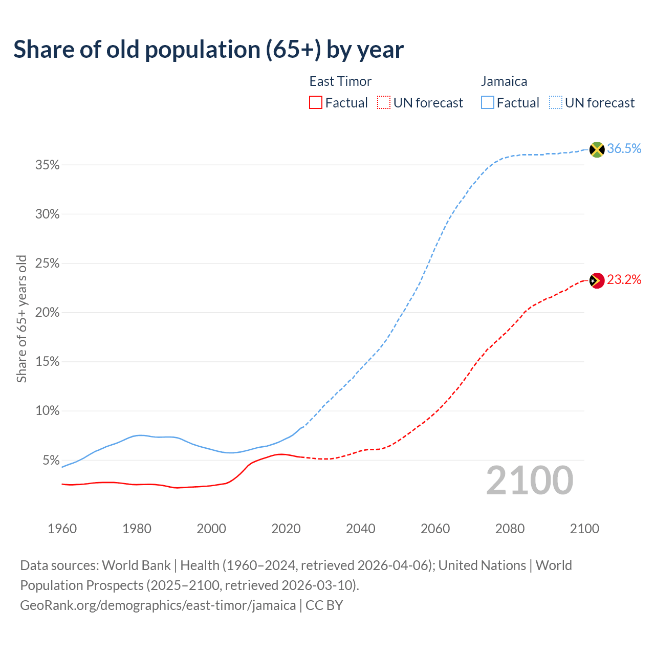 The share of older people aged 65 and over is 5.28% in East Timor and 8.21% in Jamaica. Life expectancy in East Timor compared to Jamaica .