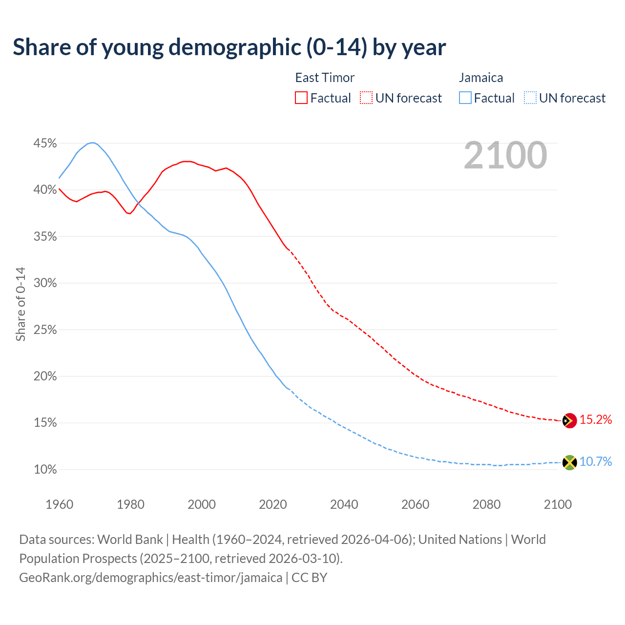 - The share of young demographic (0-15 years old) in East Timor is 33.7% vs 18.7% in Jamaica.