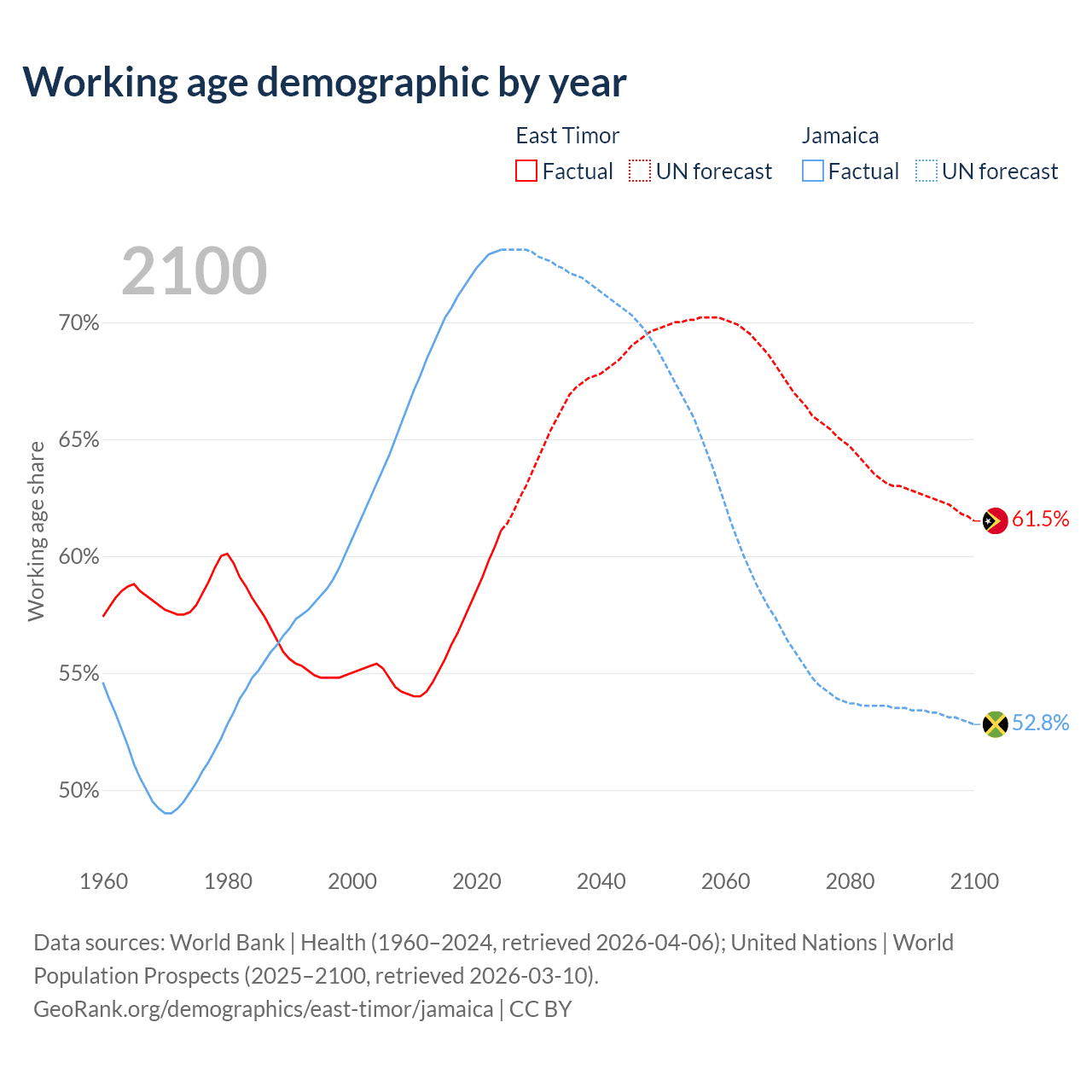 Median age East Timor vs Jamaica, 1960-2100