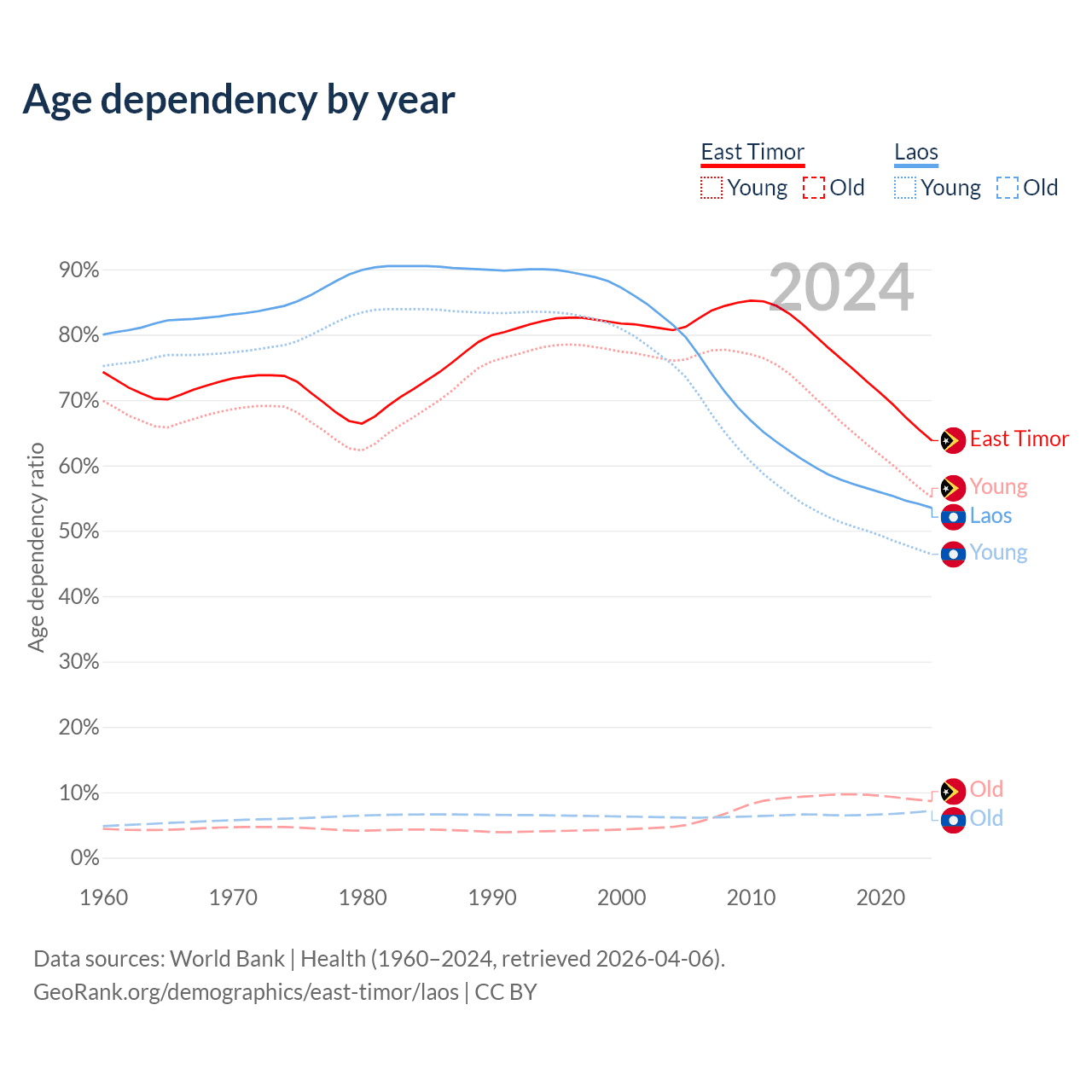 - The share of old-age demographic (65+) in East Timor is 5.28% vs 4.67% in Laos.