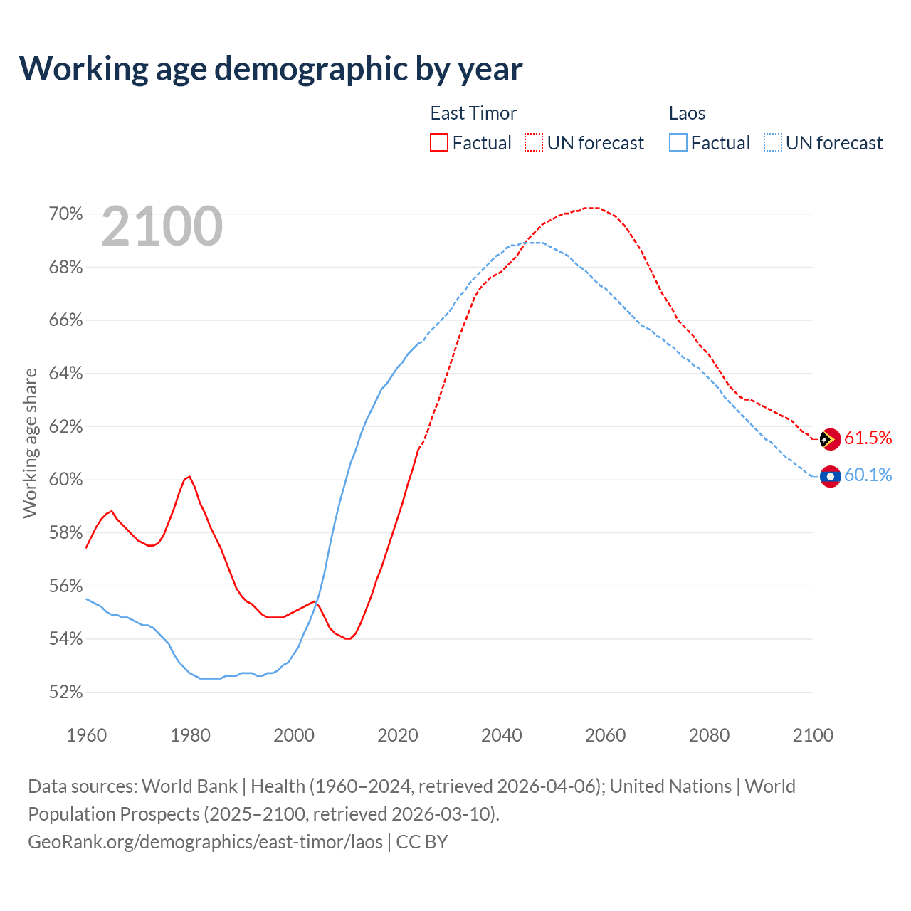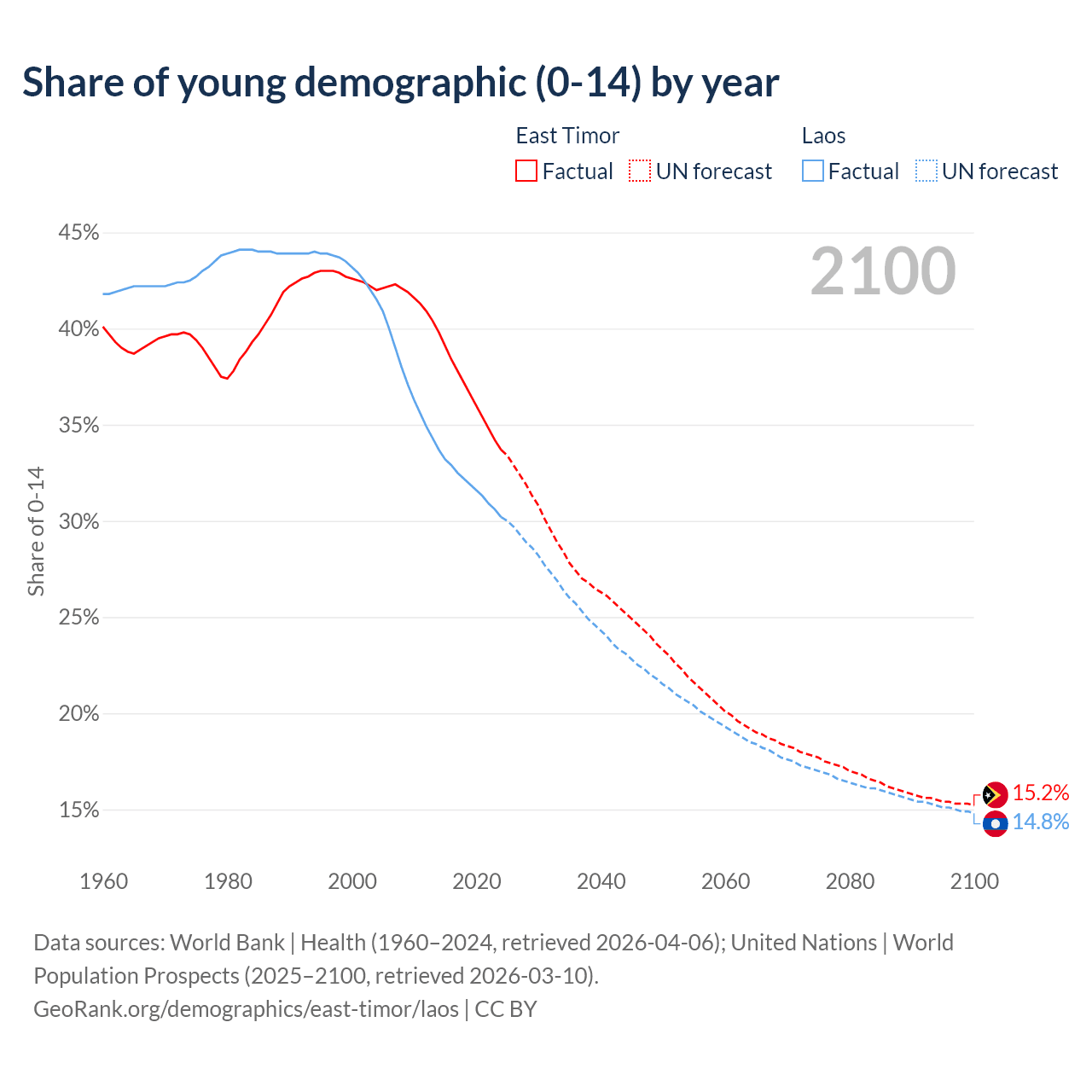 - As of 2026, the population of East Timor is 1.44M vs 8M in Laos - 5.55 times difference.