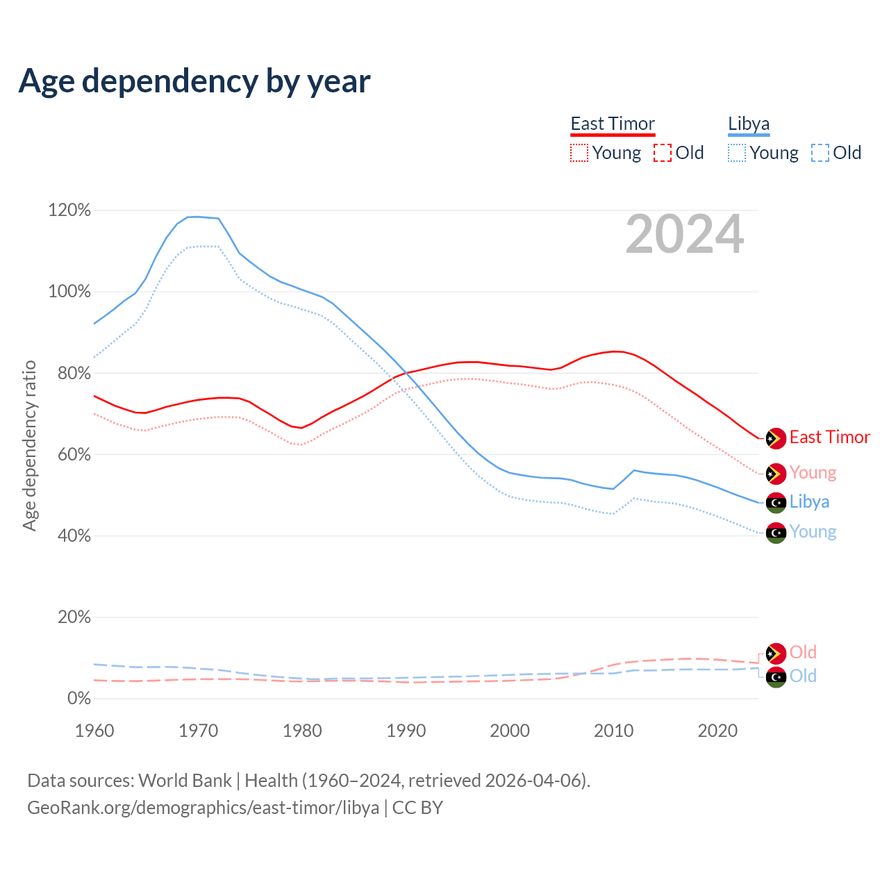 - The share of old-age demographic (65+) in East Timor is 5.28% vs 5.02% in Libya.