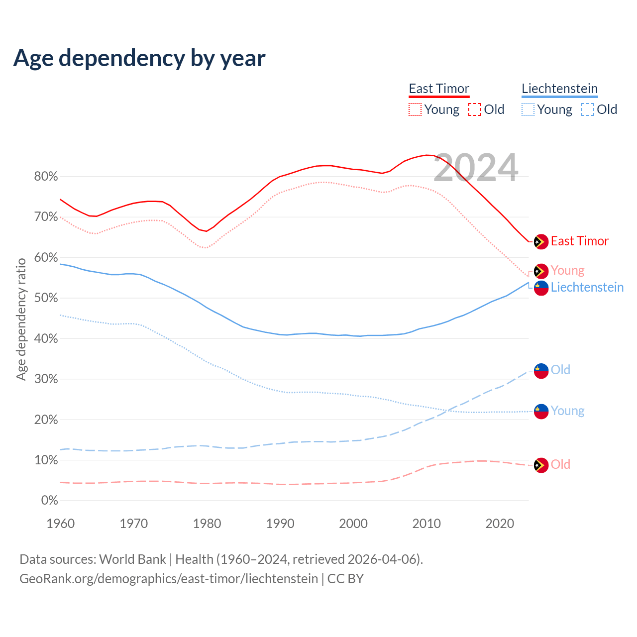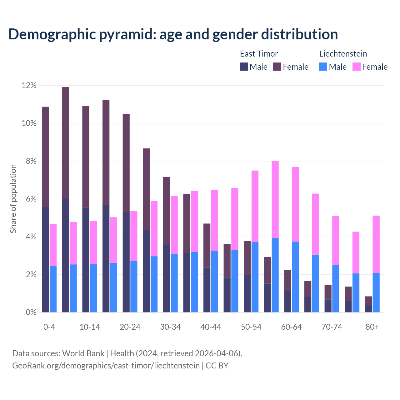 - The share of old-age demographic (65+) in East Timor is 5.28% vs 20.7% in Liechtenstein.
