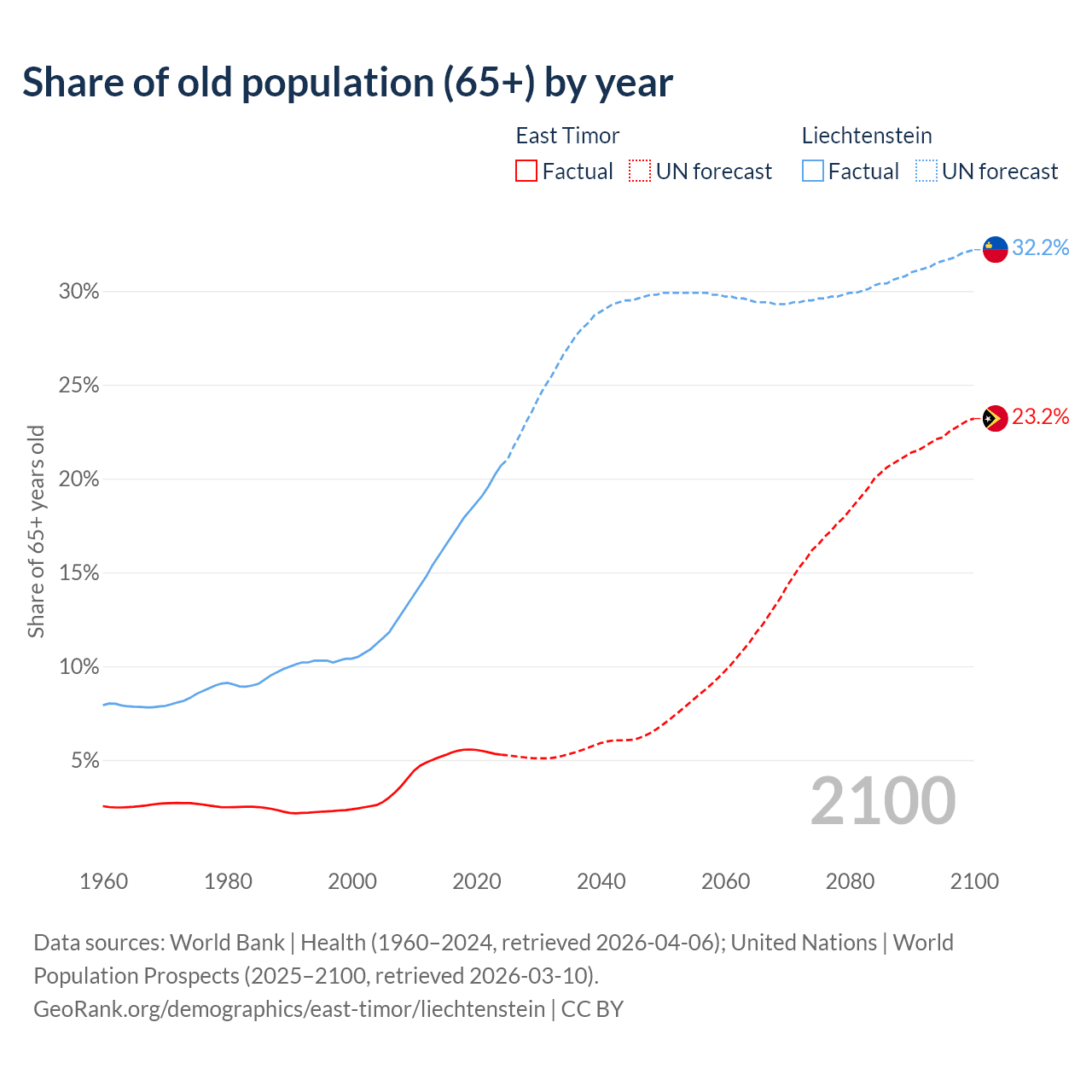The share of older people aged 65 and over is 5.28% in East Timor and 20.7% in Liechtenstein. Life expectancy in East Timor compared to Liechtenstein .