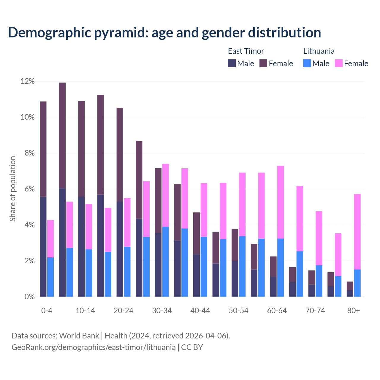 - The share of old-age demographic (65+) in East Timor is 5.28% vs 20.2% in Lithuania.