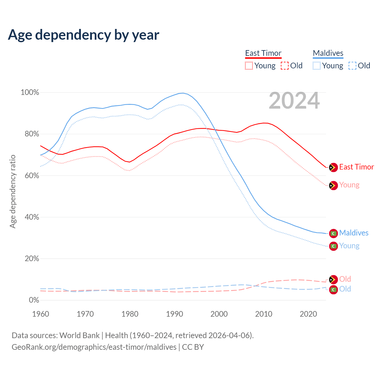 - East Timor is ranked 145/196 by median age (oldest to youngest) vs 90/196 for Maldives.