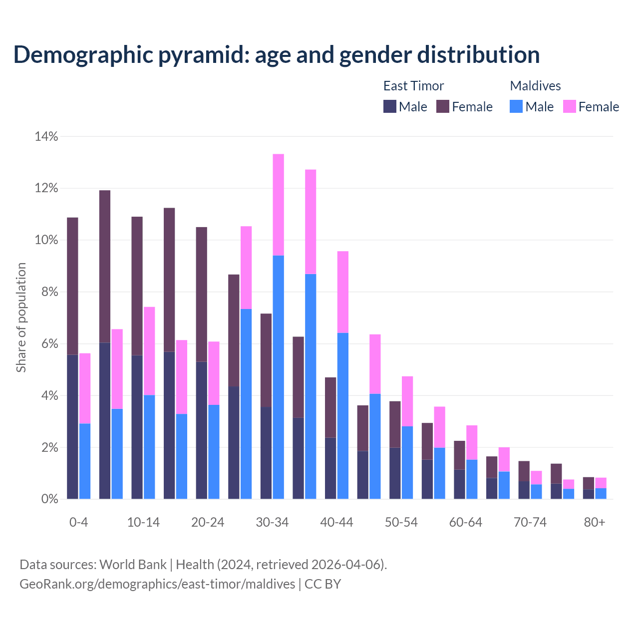 - The share of young demographic (0-15 years old) in East Timor is 33.7% vs 19.6% in Maldives.